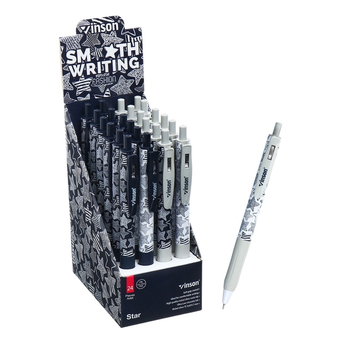 Автоматическая масляная ручка «Vinson Star» подойдёт тем, кто хочет получать стабильную синюю линию без рывков и излишнего нажима. Письмо ощущается плавным и предсказуемым. Грип создаёт комфортную опору для пальцев. Рука меньше устаёт при длительных записях, а движение становится более уверенным. Масляные чернила формируют плотный след, который подчёркивает выразительность текста — заметки и подписи приобретают цельный вид.