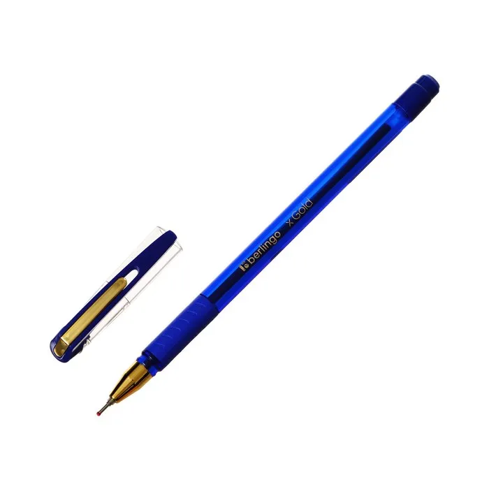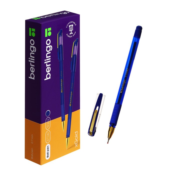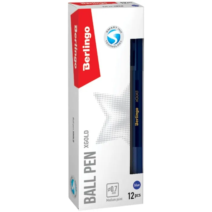 Ручка шариковая Berlingo xGold – это флагманская модель ассортимента Berlingo. 12 штук в упаковке. Цвет чернил: синий. Толщина линии письма: 0,5 мм. Длина письма: 850 м. Не раз становилась официальной ручкой «Тотального диктанта» – ежегодной образовательной акции популяризации грамотности. Кроме того, xGold является обладателем премии «Выбор канцелярского рынка 2018». Ручка оснащена вентилируемым колпачком, который обеспечивает безопасность при использовании детьми. Удобный пластиковый клип позволяет закрепить ручку, например, на ежедневнике или тетради. Мягкий резиновый грип препятствует скольжению пальцев и обеспечивает комфортное письмо. Диаметр пишущего узла составляет 0,7 мм, благодаря чему ручка прекрасно подходит для любого стиля письма.Уникальная запатентованная технология Smart Ink обеспечивает лёгкое и приятное письмо за счёт использования чернил пониженной вязкости, специальной конструкции пишущего узла и инновационных материалов шарика и пишущего узла. Инновационные компоненты, используемые для изготовления шарика пишущего узла (карбид вольфрама), обеспечивают долговечность и стабильность качества письма. Технология Smart Ink, Цвет чернил: синий, Толщина линии письма: 0,5 мм, Длина письма: 850 м, Цвет корпуса: синий.