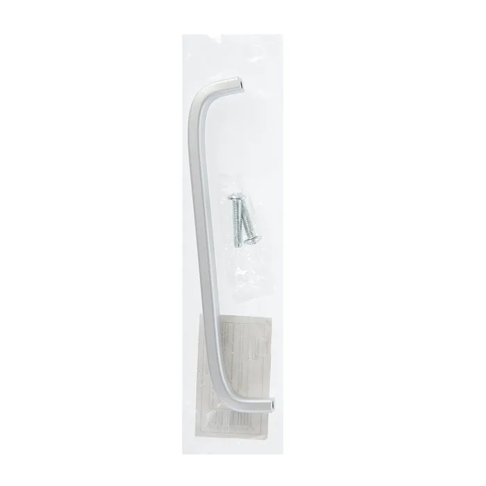 Данная дверная ручка представляет собой неподвижную скобу, которая крепится к поверхности мебели с помощью двух винтов. Модель выполнена из прочного алюминия и имеет матовый серебристый цвет.