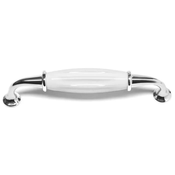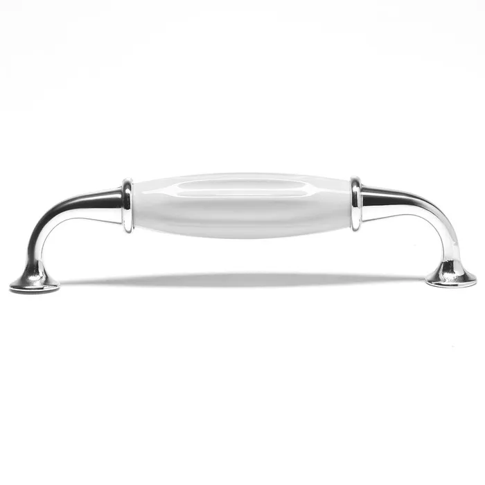 Интересный дизайн ручки сочетается с различными типами мебельного гарнитура. Фурнитура имеет привлекательный внешний вид и компактный размер. Хромированный оттенок металла в сочетании с белоснежной керамикой идеально подходит к мебельным фасадам в различной цветовой гамме.