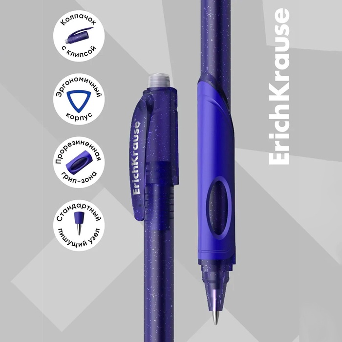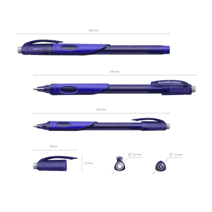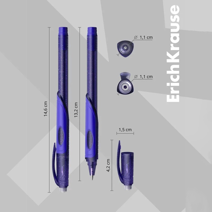 - Ручка имеет тонированный круглый корпус с блестками и треугольную эргономичную грип-зону с выемками для пальцев, с ластиком на колпачке.