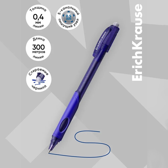 Ручка со стираемыми чернилами гелевая ErichKrause ErgoLine Magic, узел 0.5 мм, чернила синие, длина линии письма 300 метров — Характеристики