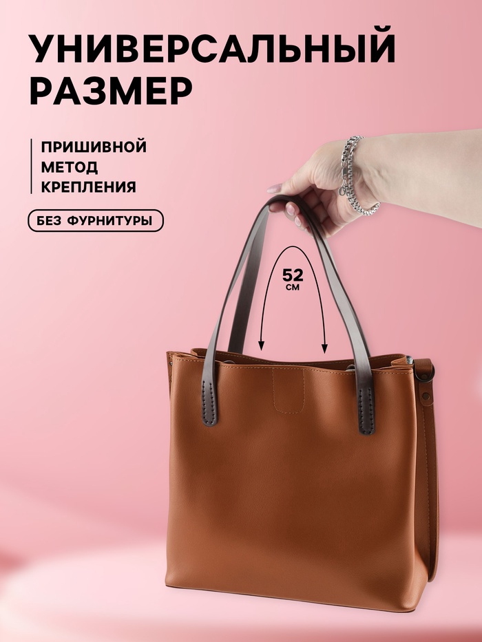 Пара коричневых ручек для сумки из искусственной кожи — универсальное решение для ремонта или замены изношенных деталей. Длина 52 см подходит для большинства моделей, а лаконичный дизайн без фурнитуры легко сочетается с разными стилями.