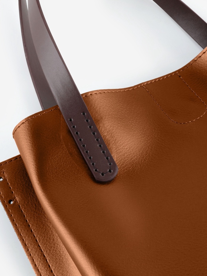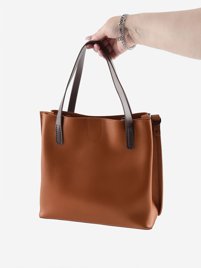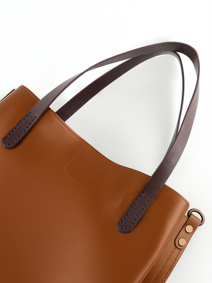 - Нейтральный коричневый оттенок не конфликтует с цветом сумки.