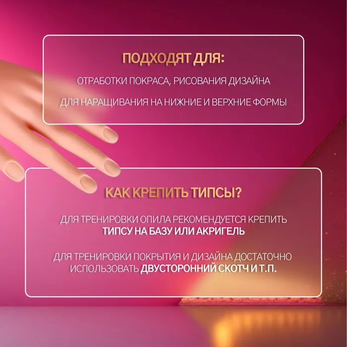 - Создания дизайнов и наращивания ногтей: Муляж устойчив к воздействиям материалов для наращивания, легко очищается и не требует сложного ухода.
