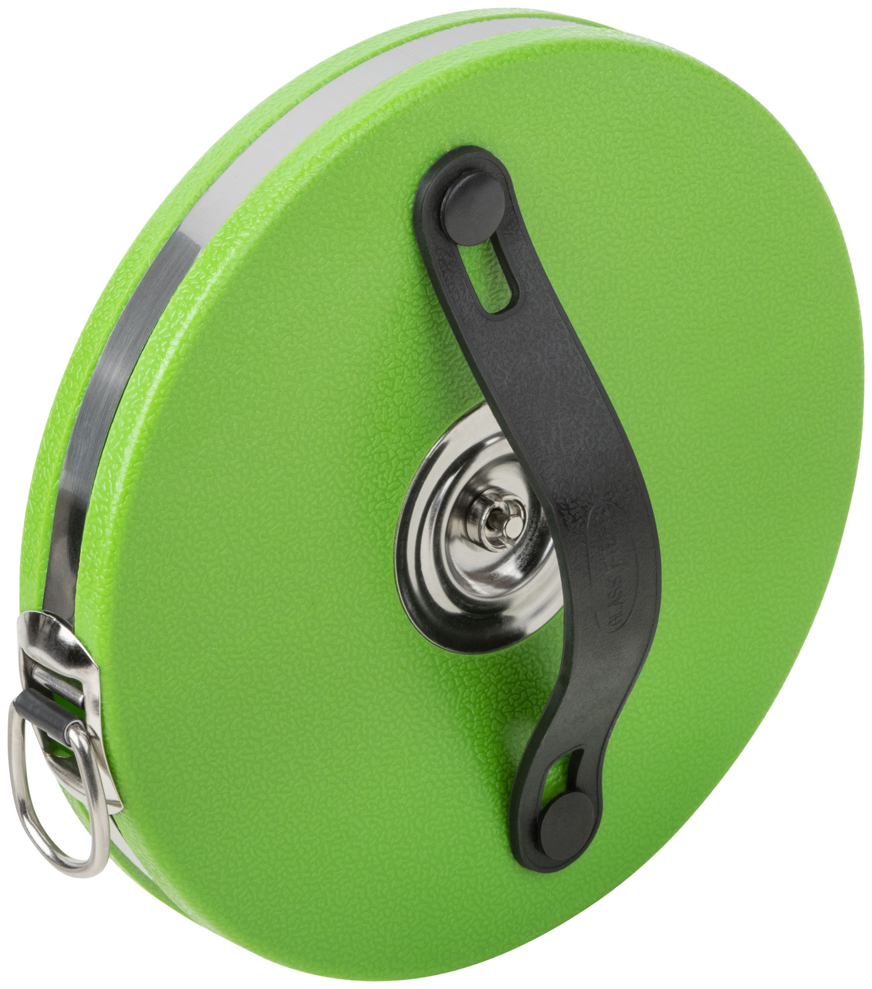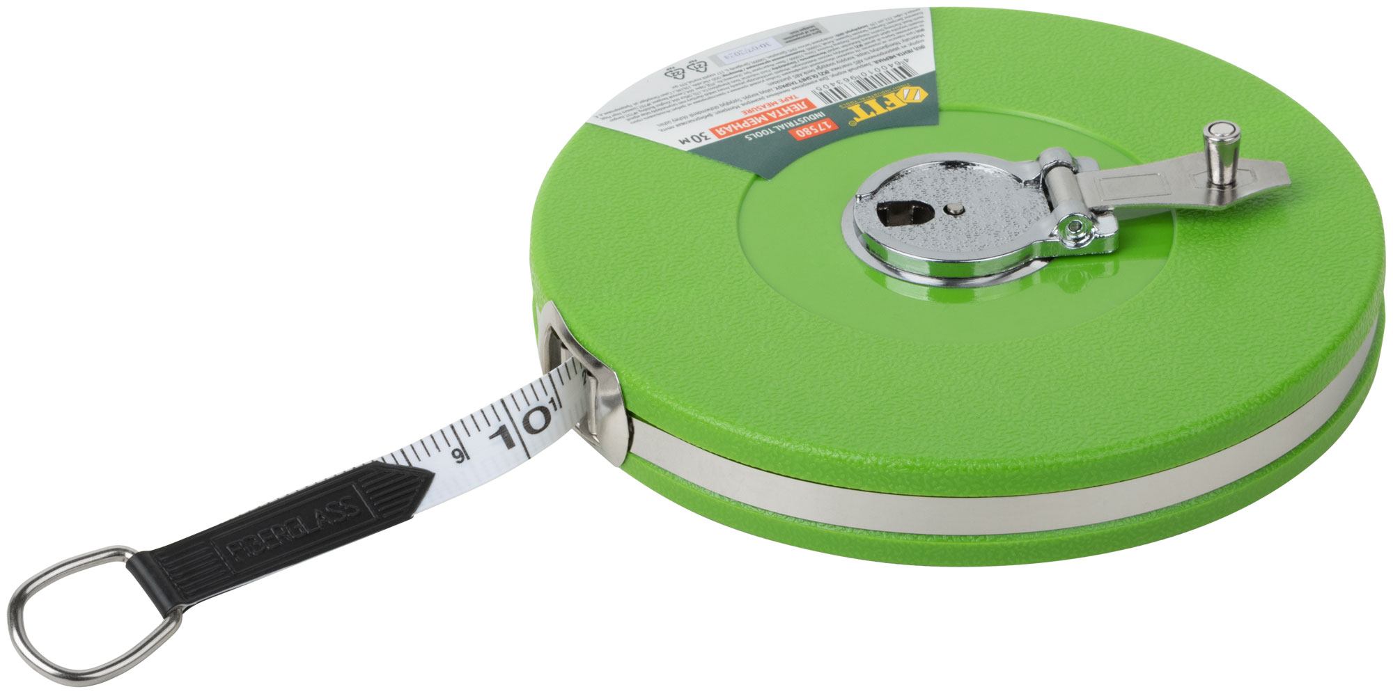 Фиберглассовая лента устойчива к растяжению и изгибам, что обеспечивает долговечность и точность измерений. Зеленый пластиковый корпус защищает рулетку от механических повреждений и позволяет использовать её даже в сложных условиях.