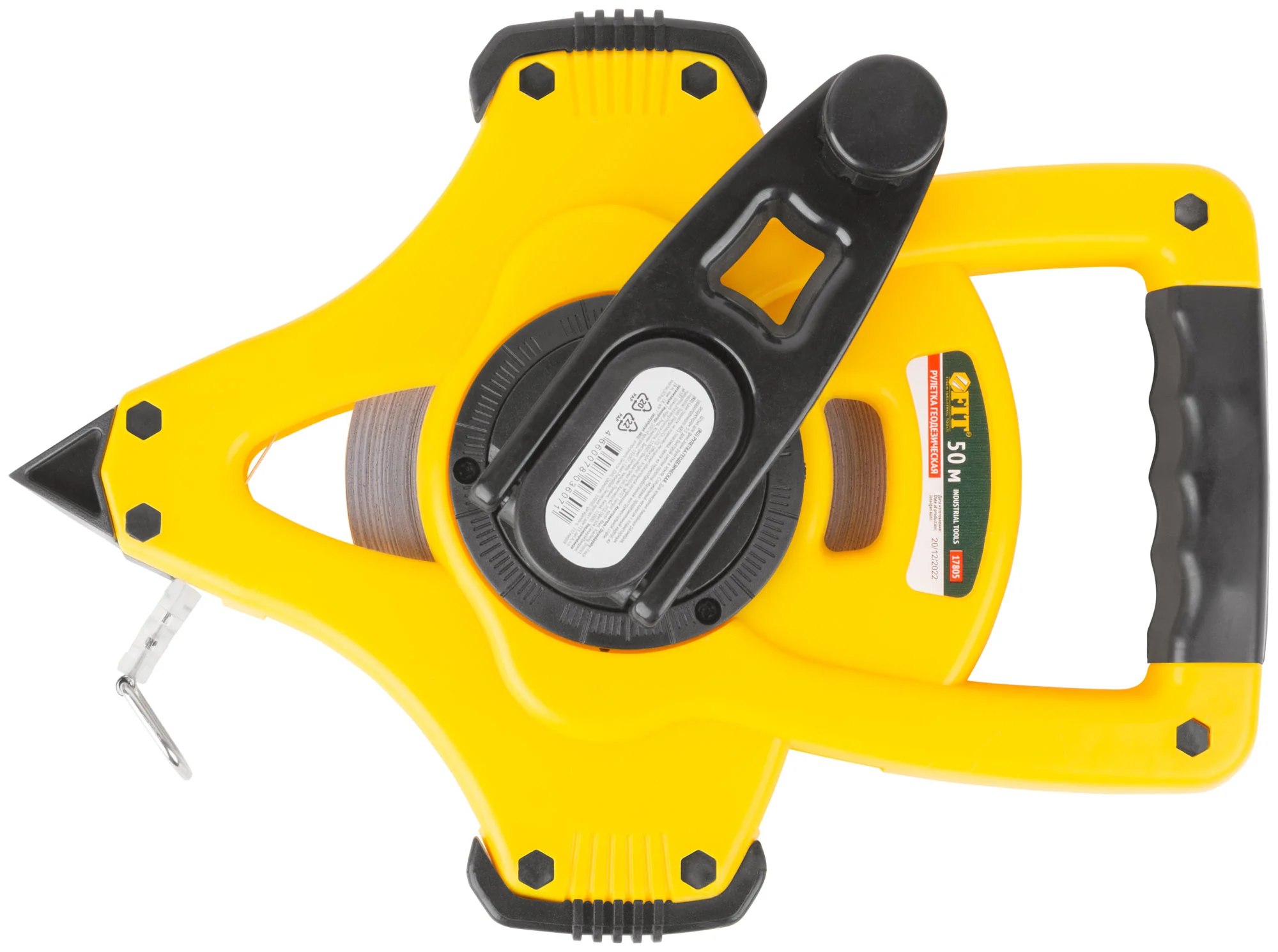 Корпус рулетки выполнен из ударопрочного ABS пластика, что обеспечивает долговечность и защиту от повреждений. Прорезиненная ручка обеспечивает удобный и надежный хват, даже в сложных погодных условиях. Ускоренная перемотка с планетарным редуктором 3:1 значительно экономит время на работе.