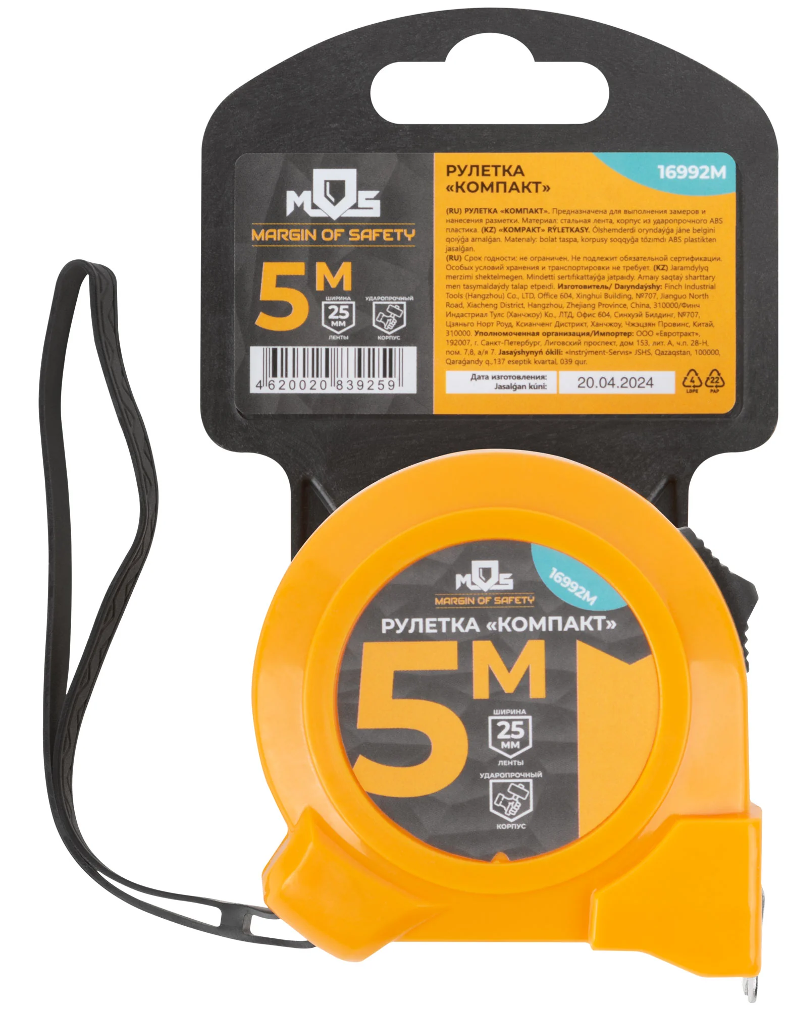 Корпус рулетки изготовлен из ударопрочного ABS пластика, что обеспечивает долговечность и надежную защиту от повреждений. Стальная лента гарантирует точные измерения и устойчивость к износу.