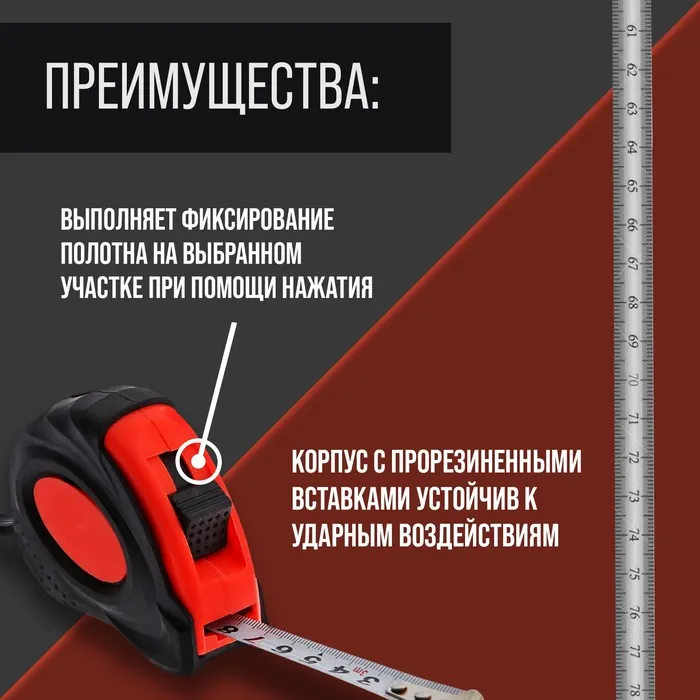 Измерительная лента выполнена из металла с чёткой прорисовкой единиц измерения на 3 метра. Специальный фиксатор позволит зафиксировать ленту на необходимой отметке.