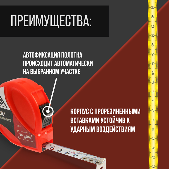 - Ширина ленты 19 мм: Стандартная ширина обеспечивает хорошую жёсткость ленты для удобного замера на весу.