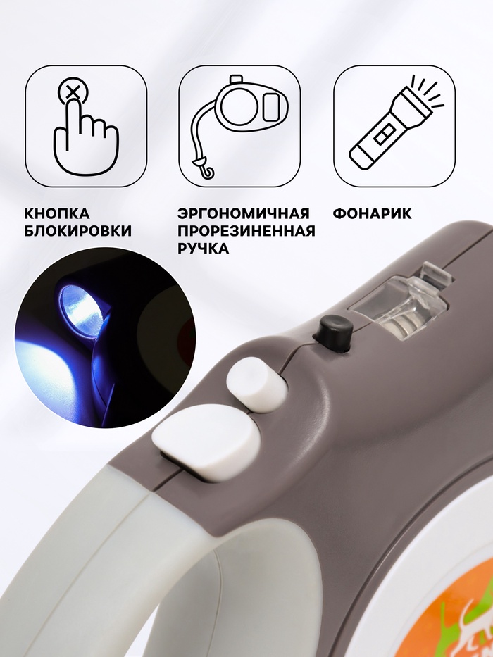 Рулетка для собак с фонариком и прорезиненной ручкой - это идеальный инструмент для прогулок со своим питомцем в темное время суток.Подойдет для собак мелких, средних и крупных пород.Фонарик, встроенный в рулетку, предоставляет яркое освещение. Теперь вы можете быть уверены в безопасности вашей собаки даже в полной темноте!Прорезиненная ручка рулетки обеспечивает комфортный и надежный захват, не скользит в руке и не вызывает дискомфорта при длительных прогулках. Благодаря резиновому покрытию, рулетка не скользит даже при сырой погоде или во время интенсивной активности вашей собаки.Основные преимущества рулетки для собак с фонариком и прорезиненной ручкой:1. Безопасность в любое время суток: фонарик позволяет видеть вашего питомца даже в темноте.2. Комфорт и надежность: прорезиненная ручка обеспечивает удобный захват и предотвращает скольжение.3. Прочность и долговечность: изготовлена из высококачественных материалов для длительного использования.4. Удобство в использовании: рулетка имеет кнопку блокировки, которая позволяет мгновенно остановить и закрепить веревку на нужной длине.5. Универсальность: подходит для собак разных размеров и пород.Не отказывайте себе в возможности прогуляться со своей собакой в любой момент и в любую погоду. Рулетка для собак с фонариком и прорезиненной ручкой - ваш надежный спутник в каждой прогулке!