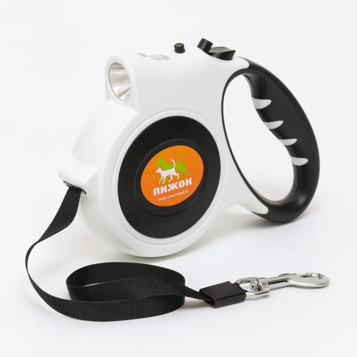Ручка изготовлена из качественного материала, который имеет прорезиненное покрытие, которое обеспечивает надежный захват при прогулке. Кроме того, рулетка "Пижон" оснащена фонариком, который позволит вам выгуливать своего питомца даже в темное время суток. Фонарик имеет яркий свет и работает от батареек, которые уже входят в комплект.