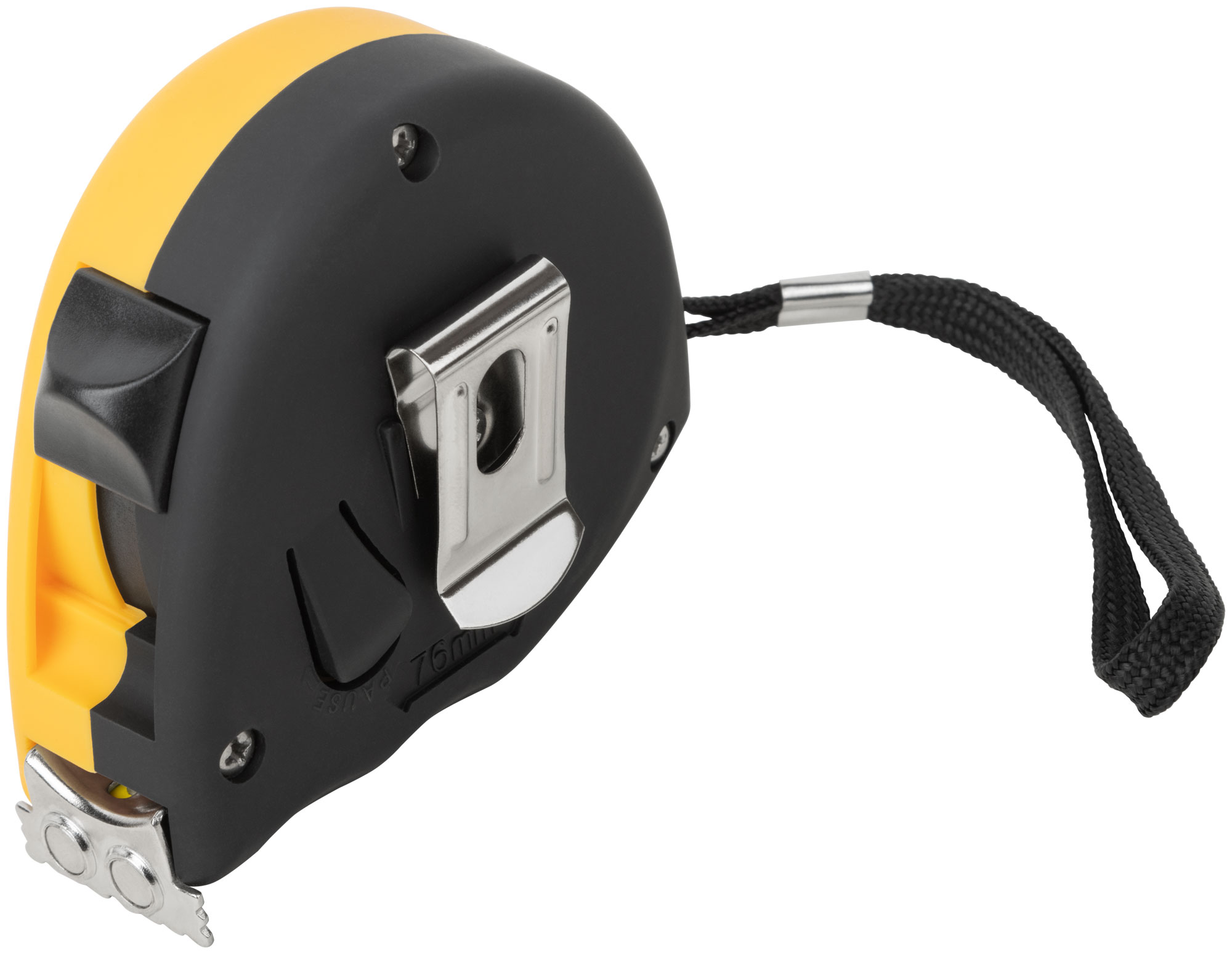 Эта модель оснащена стальной лентой с нейлоновым покрытием, что обеспечивает долговечность и защиту от износа. Эластичный противоударный корпус из ABS пластика защищает рулетку от повреждений при падениях, а двойной стопор надежно фиксирует ленту на нужной длине.