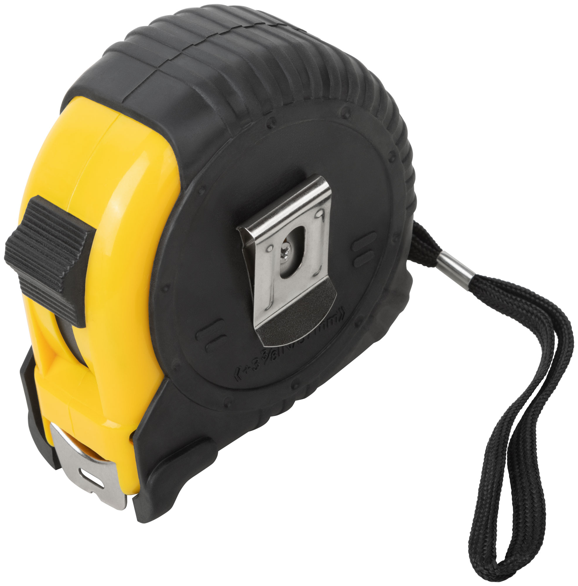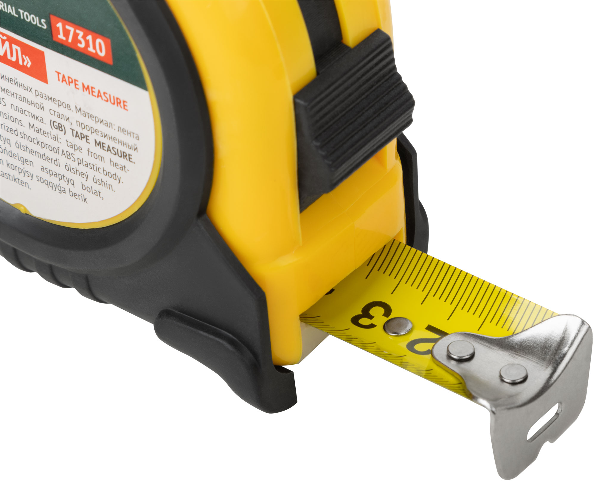 Корпус рулетки выполнен из прочного ABS пластика с прорезиненными вставками, что придает надежность и устойчивость к ударам. Стальная лента гарантирует долговечность и устойчивость к износу, позволяя выполнять измерения с высокой точностью.
