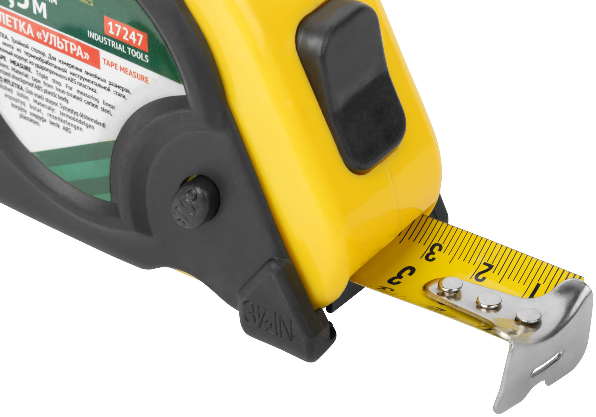 Тройной стопор позволяет надежно фиксировать ленту в нужной позиции, что значительно упрощает измерения и предотвращает соскальзывание.
