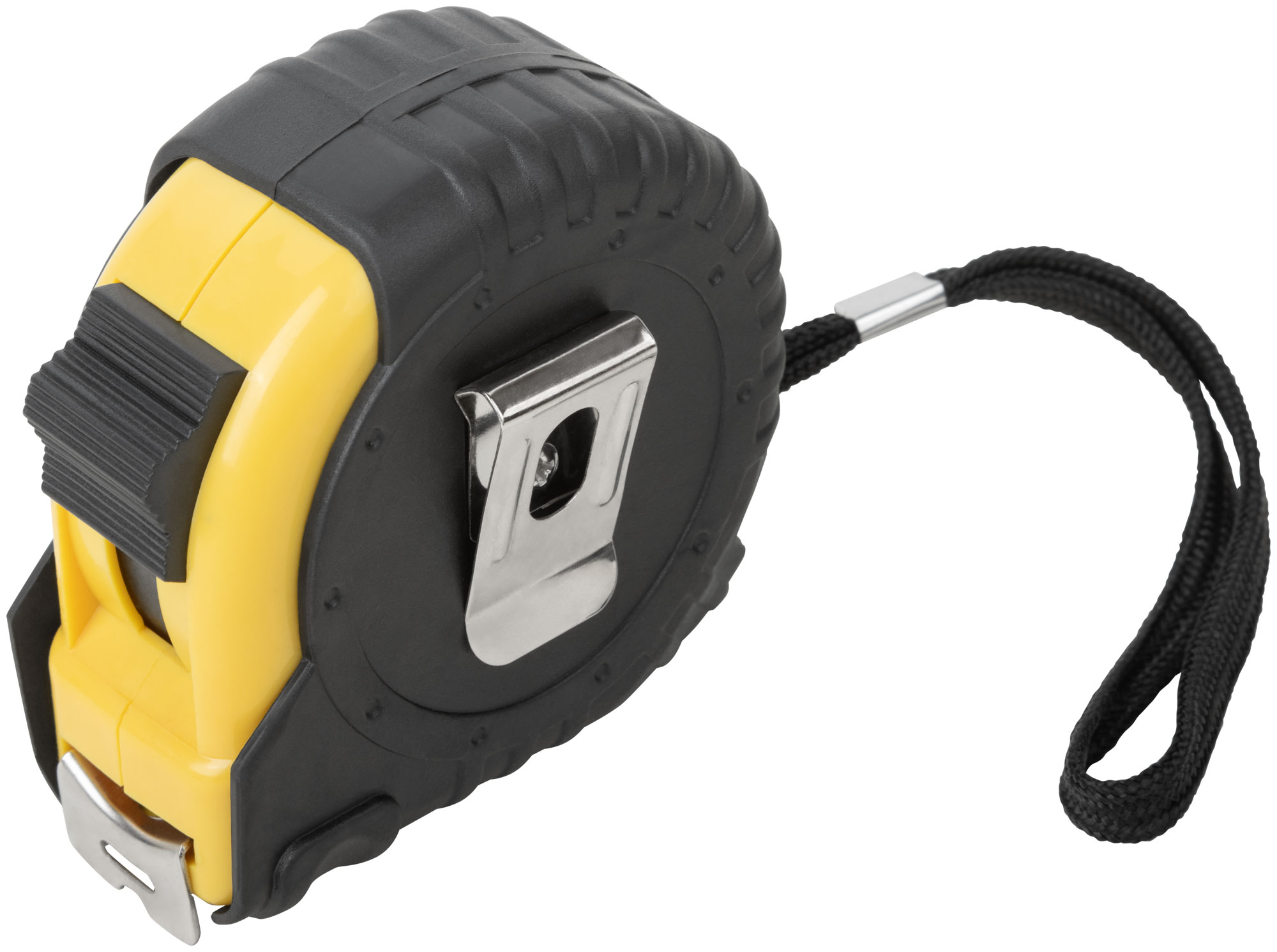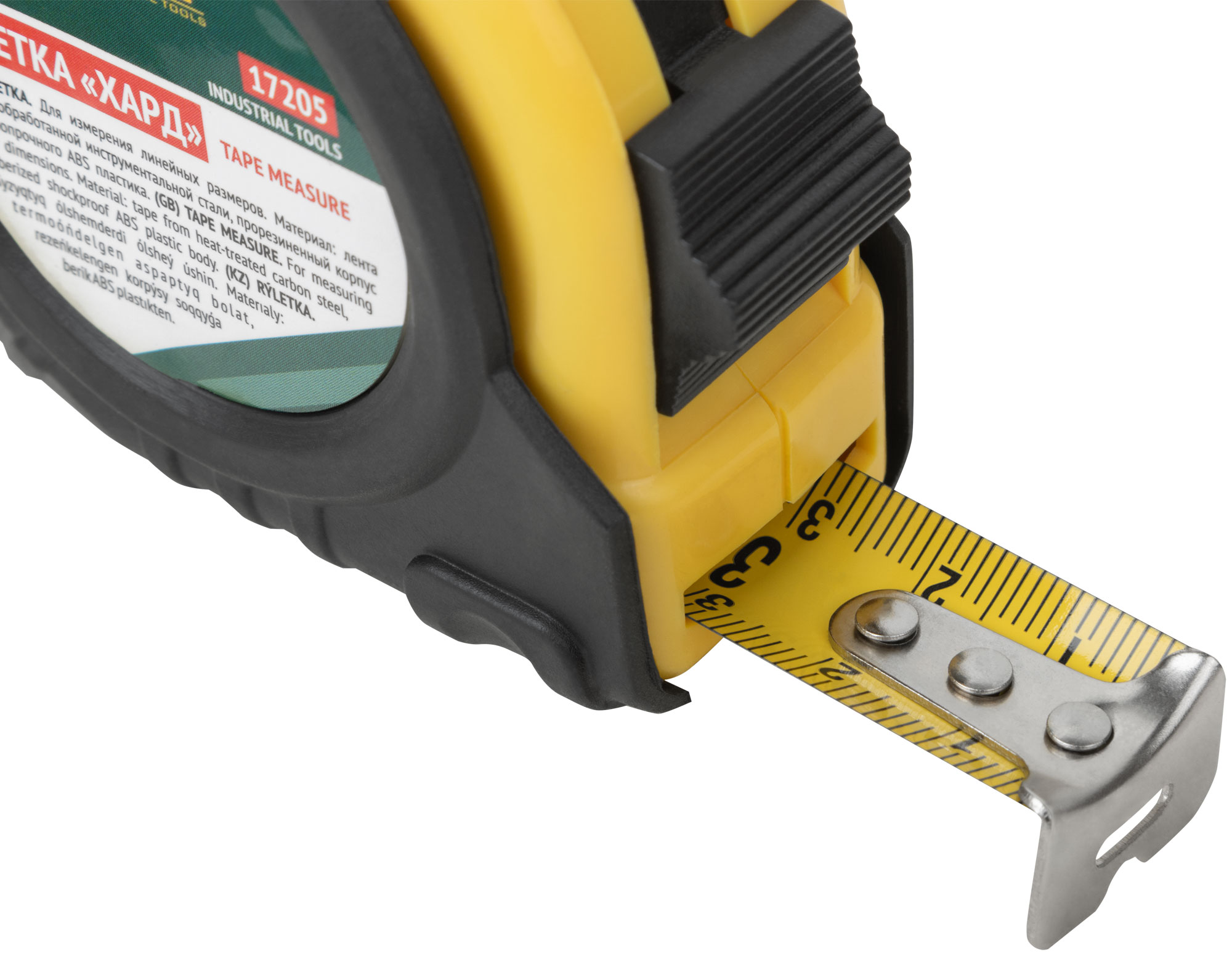 Рулетка обладает прочным прорезиненным корпусом из ABS-пластика, который защищает её от ударов и повреждений. Стальная лента длиной 5 метров и шириной 19 мм надежно фиксируется благодаря механизму стопора.