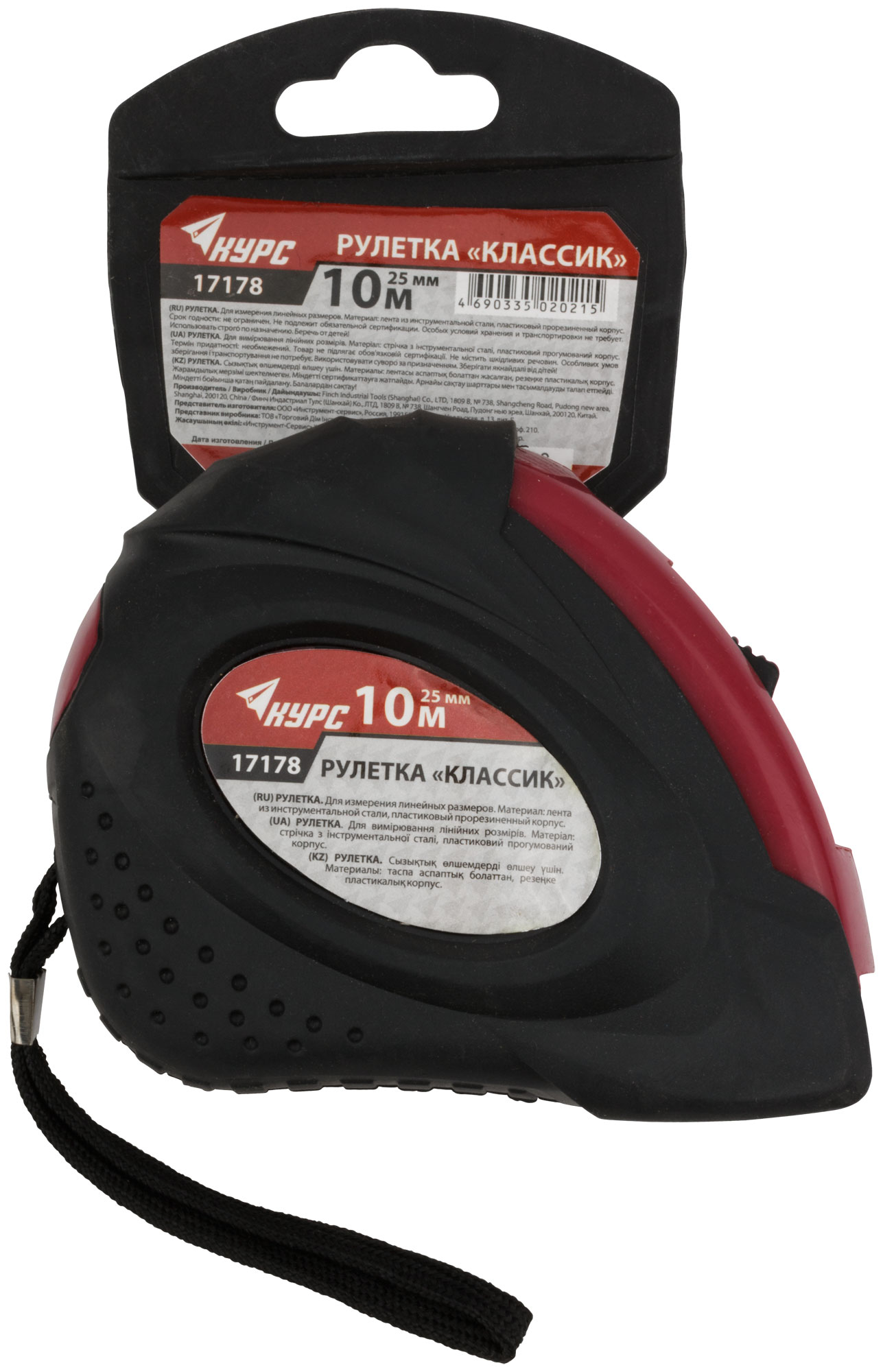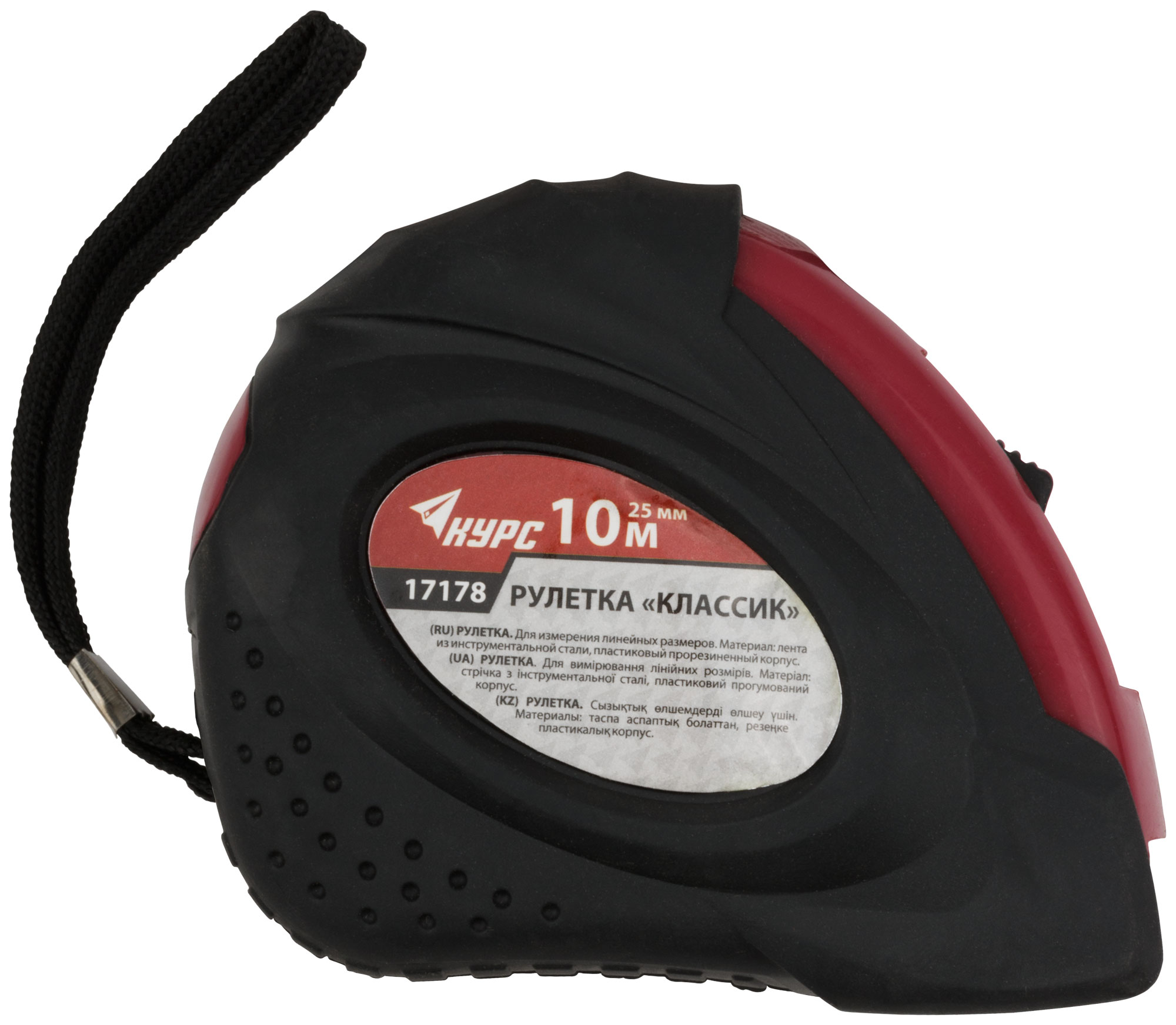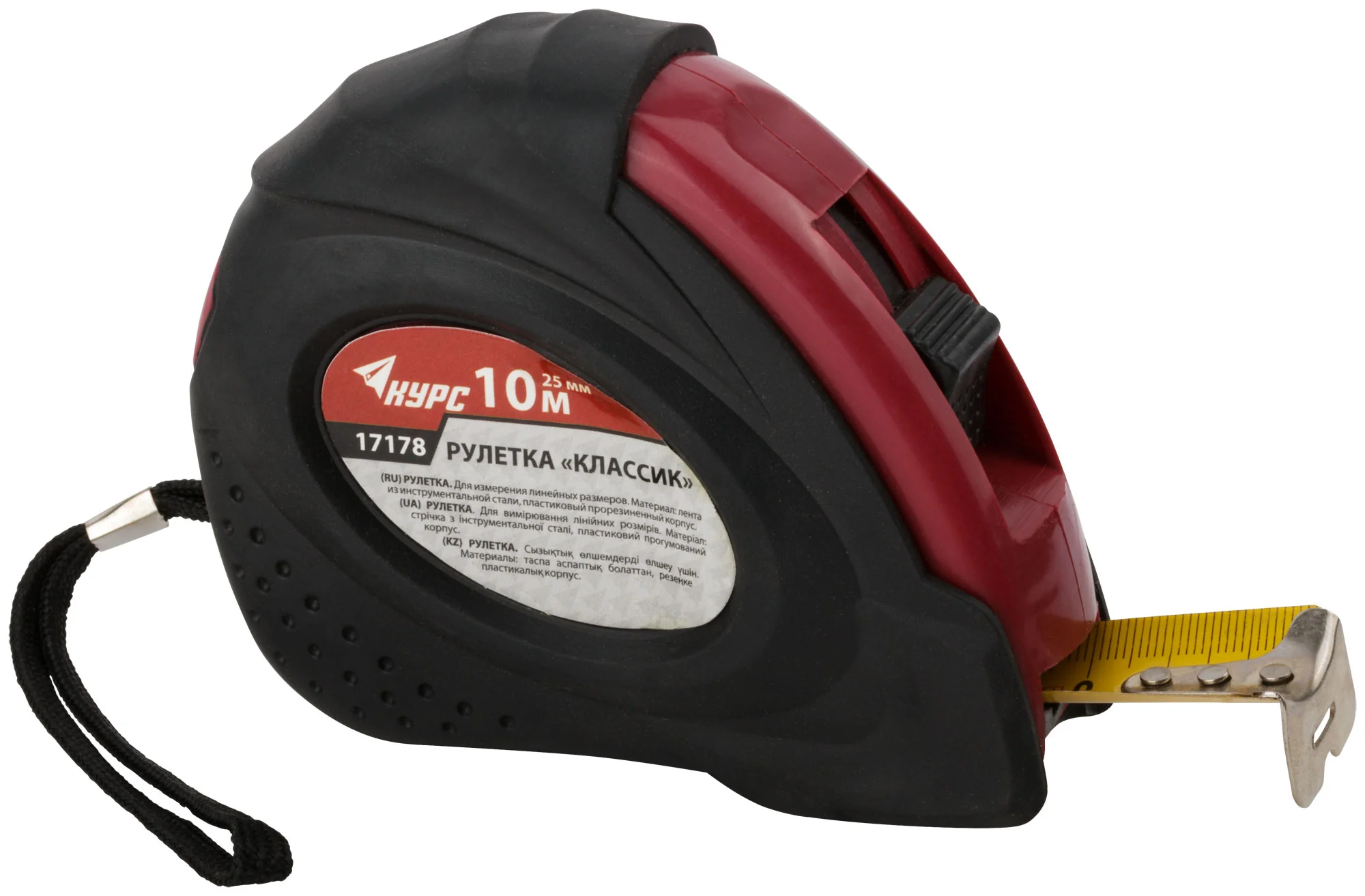 Рулетка "Классик" от бренда КУРС — идеальный инструмент для работы на строительных и ремонтных площадках. Благодаря длине 10 метров и ширине ленты 25 мм, она позволяет легко измерять большие расстояния, сохраняя точность и удобство.