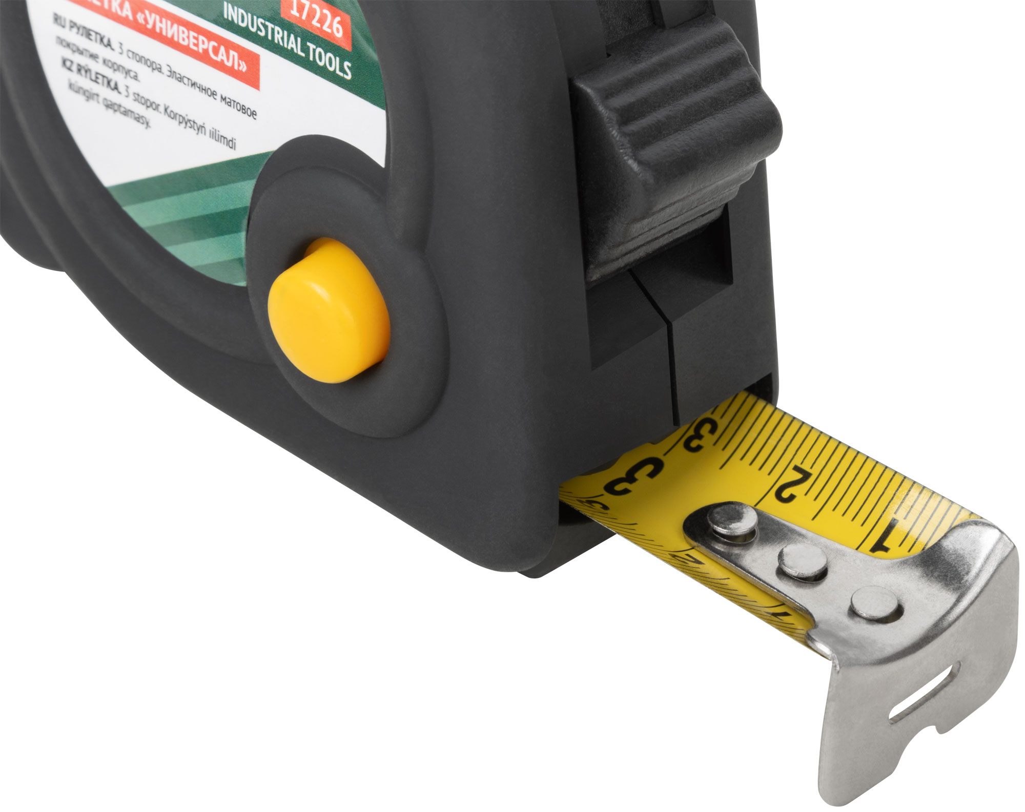 Изготовлена из прочной стальной ленты, заключенной в противоударный корпус из прорезиненного ABS-пластика, что обеспечивает долговечность и надежность в любых условиях работы. Оснащена тройным стопором для надежной фиксации ленты на необходимой длине.