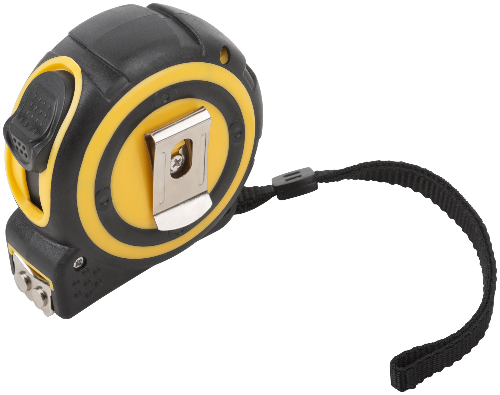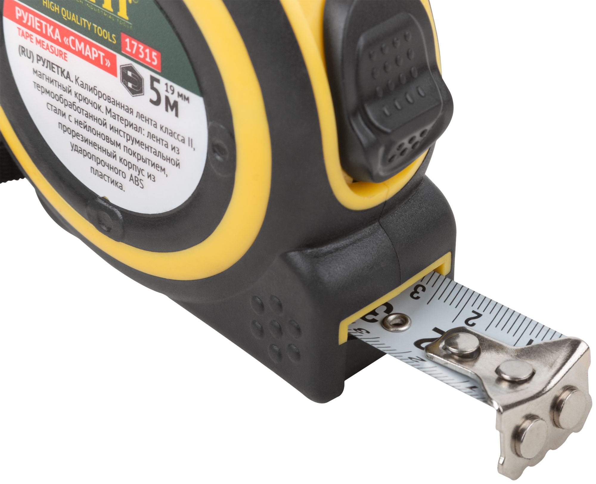 Рулетка оснащена стальной лентой с нейлоновым покрытием, что обеспечивает долговечность и устойчивость к износу. Прорезиненный корпус из ударопрочного ABS пластика защищает инструмент от повреждений при падении, а также обеспечивает удобный захват.