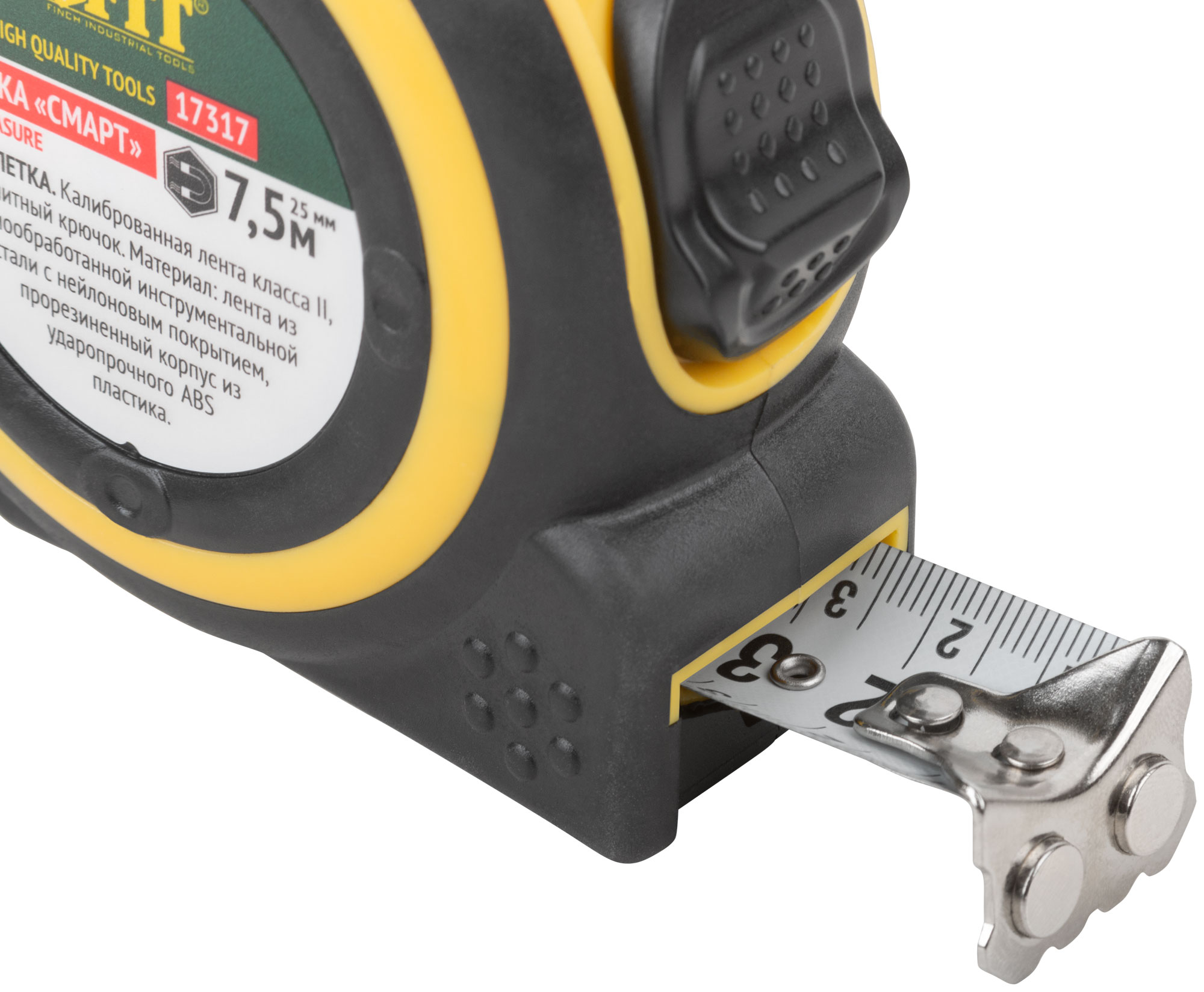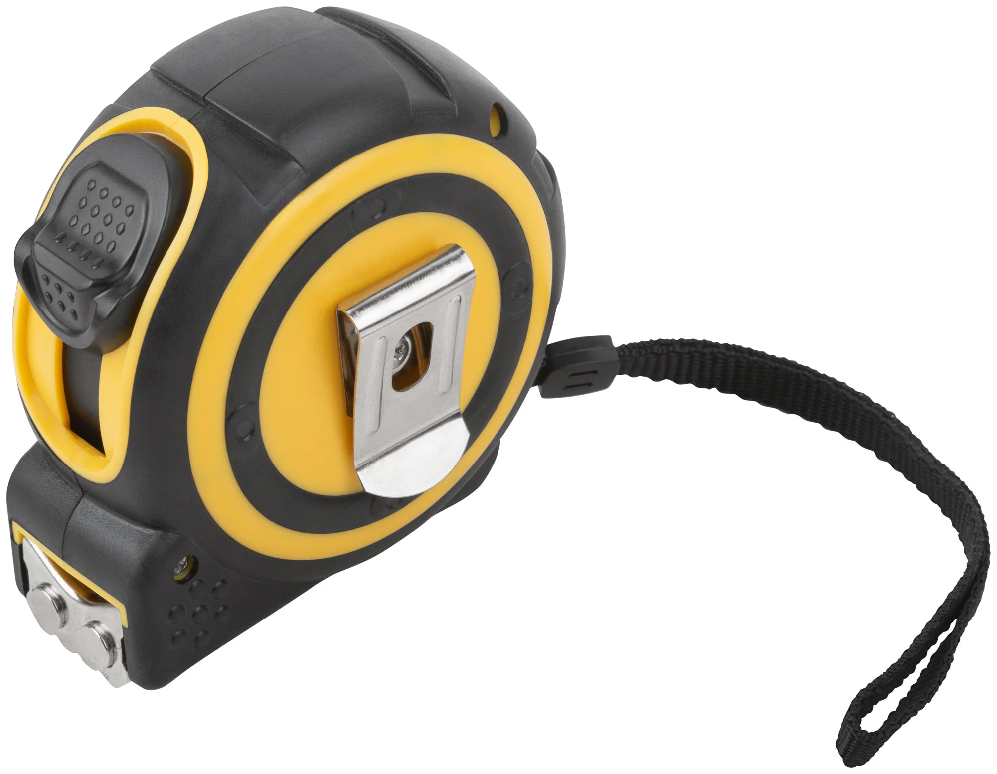 Рулетка оснащена калиброванной лентой класса II, что гарантирует высокую точность измерений. Лента изготовлена из стали с нейлоновым покрытием, обеспечивающим долговечность и устойчивость к износу. Прорезиненный корпус из ударопрочного ABS пластика защищает рулетку от повреждений при падениях.