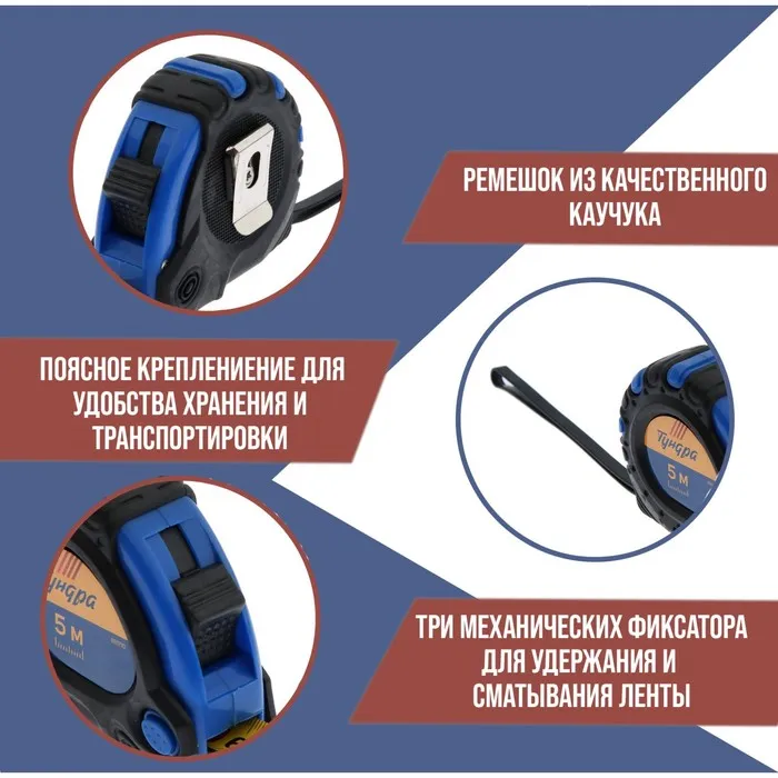 Рулетка ТУНДРА, обрезиненный корпус, 3 фиксатора, 5 м × 19 мм — Характеристики