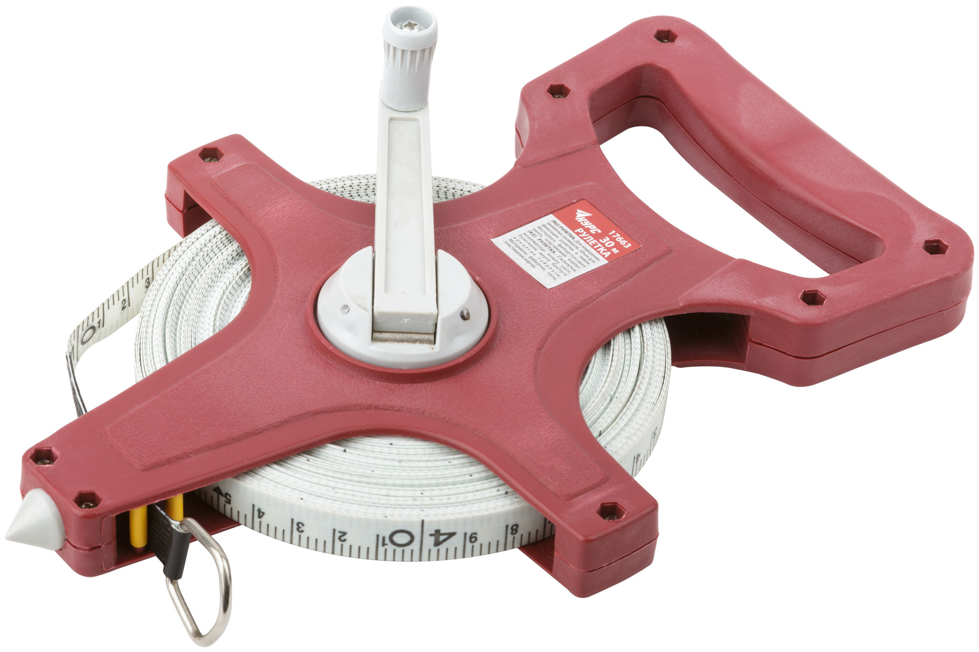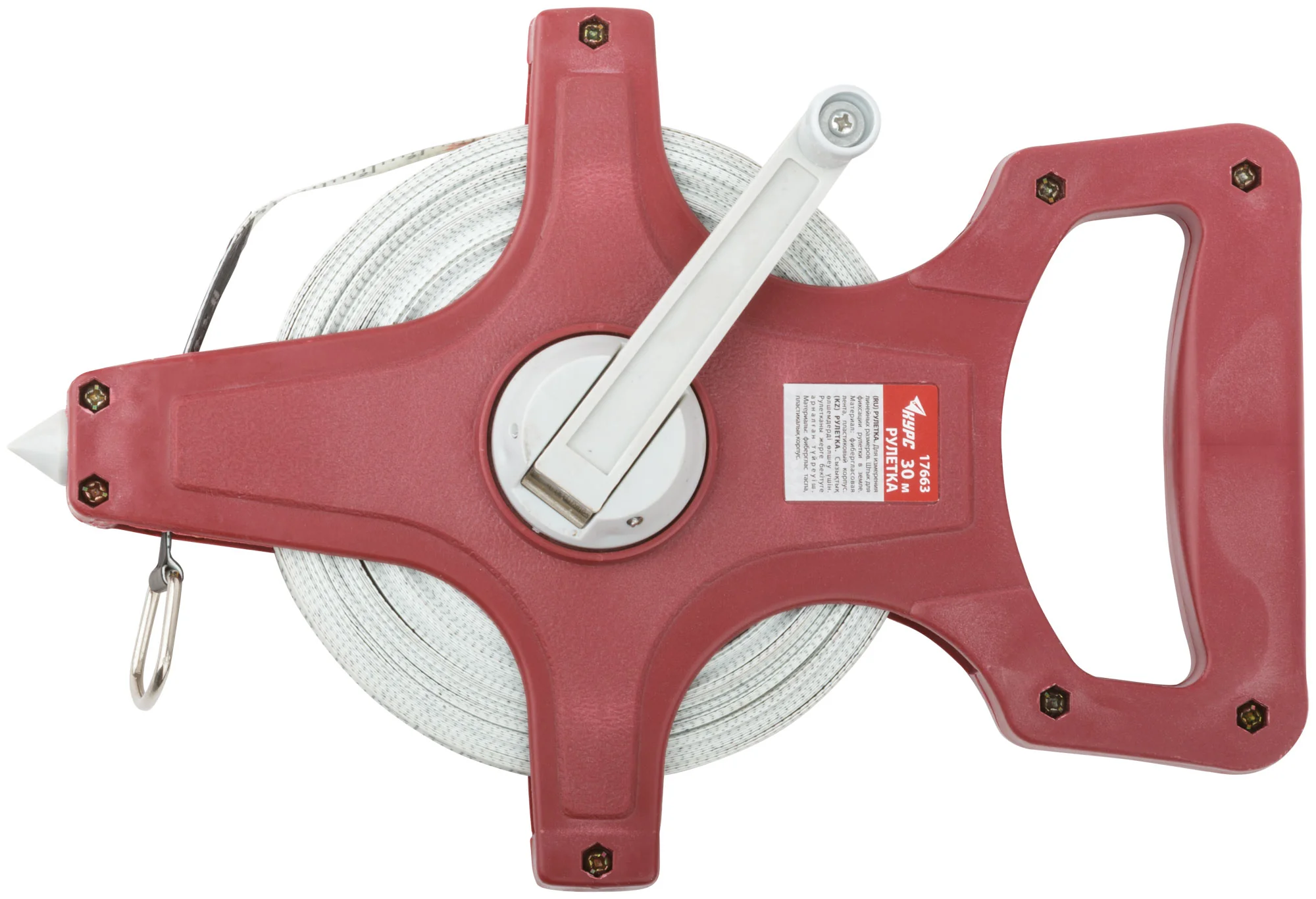 Корпус рулетки выполнен из прочного пластика, а лента изготовлена из фибергласа, что обеспечивает её долговечность и устойчивость к износу. Открытая конструкция корпуса облегчает доступ к ленте и ускоряет процесс измерения.