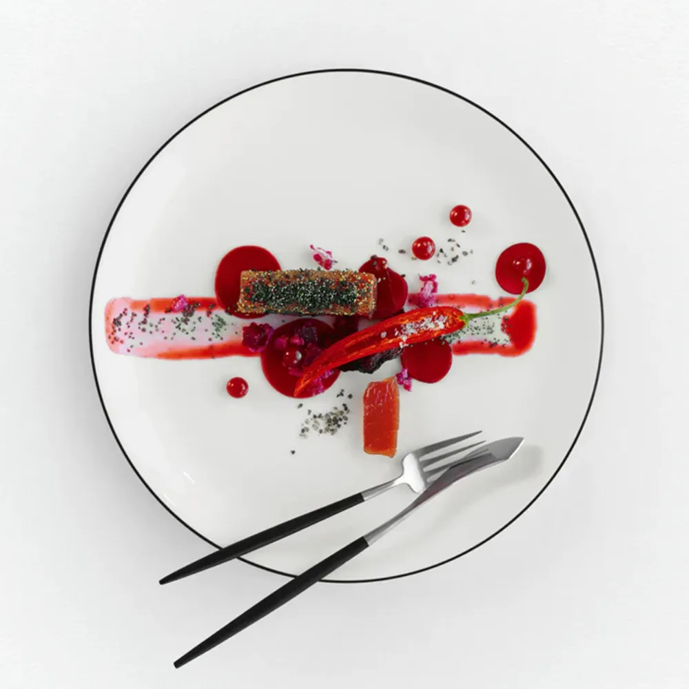 Эта тарелка диаметром 26,5 см изготовлена из тончайшего белого фарфора. Её край украшен элегантной черной каймой, которая делает её идеальным украшением для вашего стола.