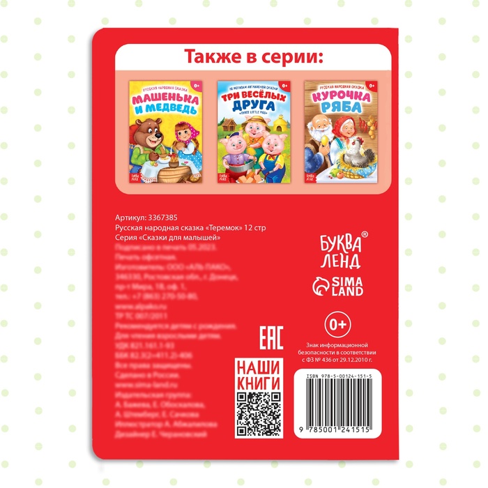 Книга «Теремок» — это дверь в мир русских народных сказок для самых маленьких. Яркие иллюстрации и простой текст помогут малышу познакомиться с добрыми героями и их поучительными историями. Книга станет первым шагом в мир чтения, развивая воображение и прививая любовь к книгам с раннего возраста.