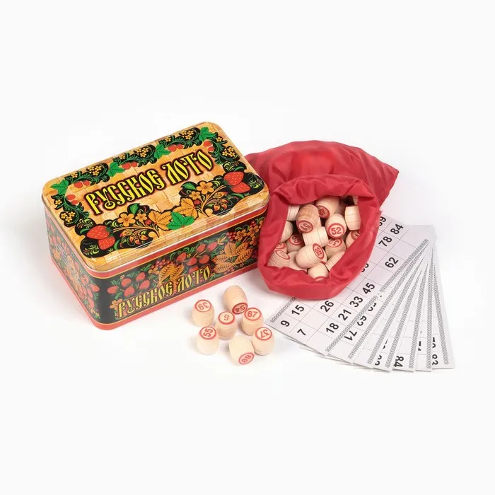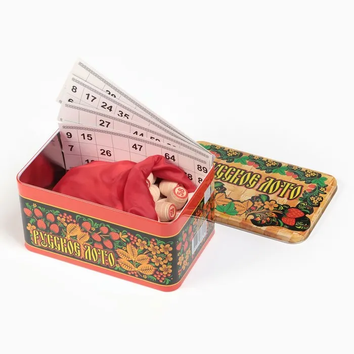 Классическая настольная игра «Русское лото» в яркой жестяной коробочке! В комплект входит прочная металлическая коробочка, гладкие березовые бочонки с хорошо прокрашенными номерами, плотные картонные карточки с высоким качеством печати, специальные яркие красные фишки и тканевый мешочек для бочонков. Эта увлекательная азартная игра доставит массу удовольствия, а также поспособствует укреплению внимательности. Послужит как для собственного пользования, так и станет отличным подарком!