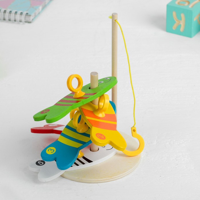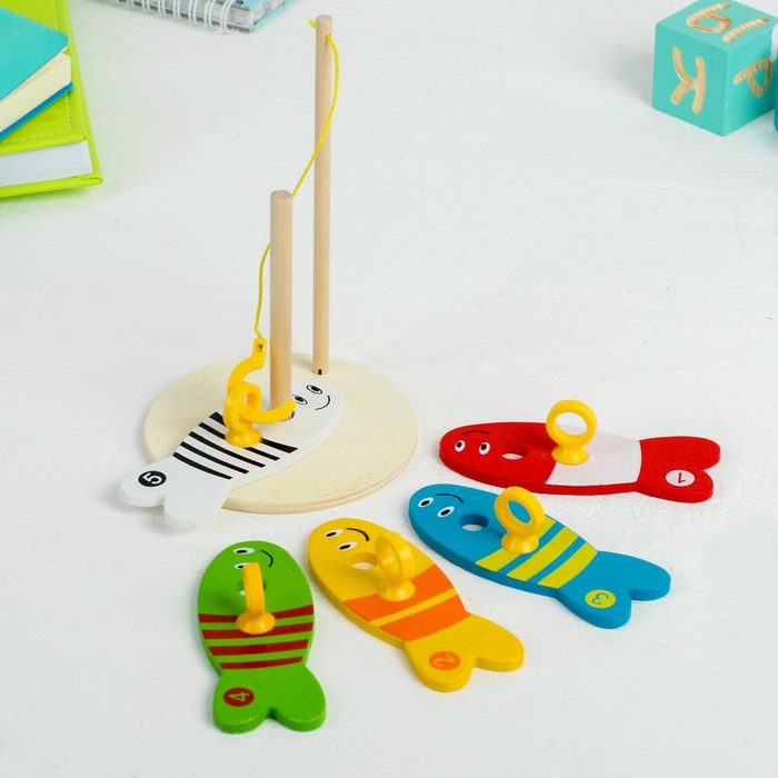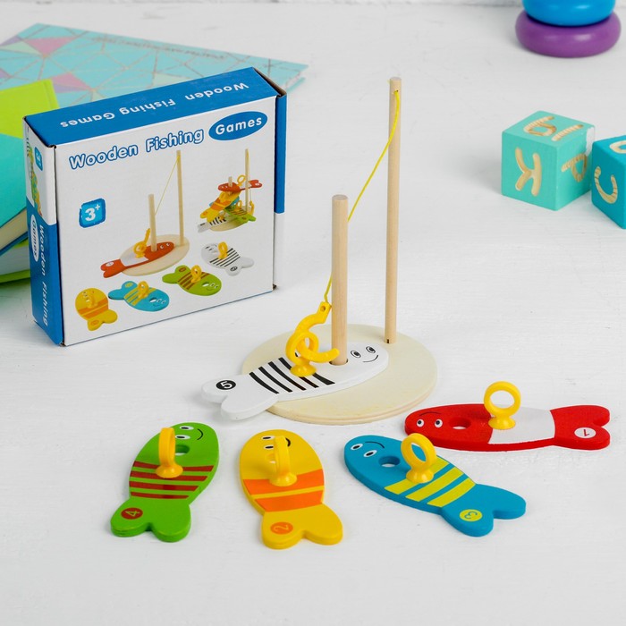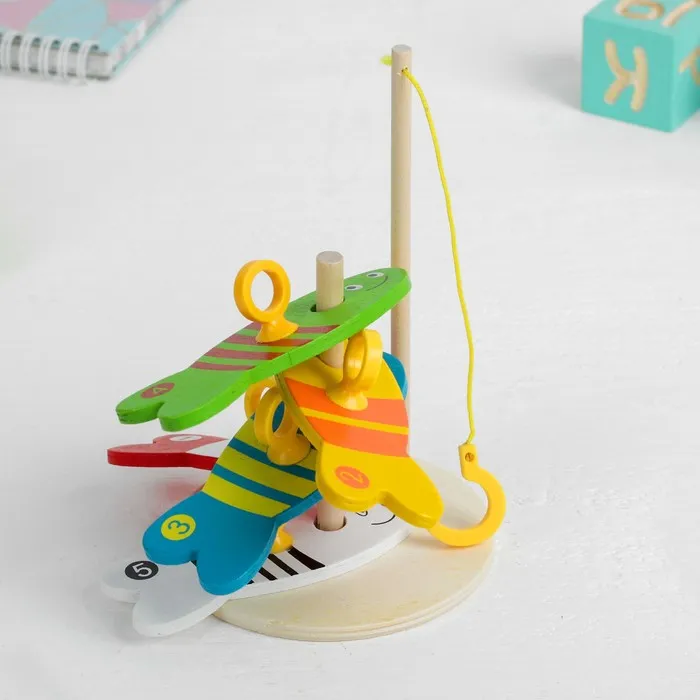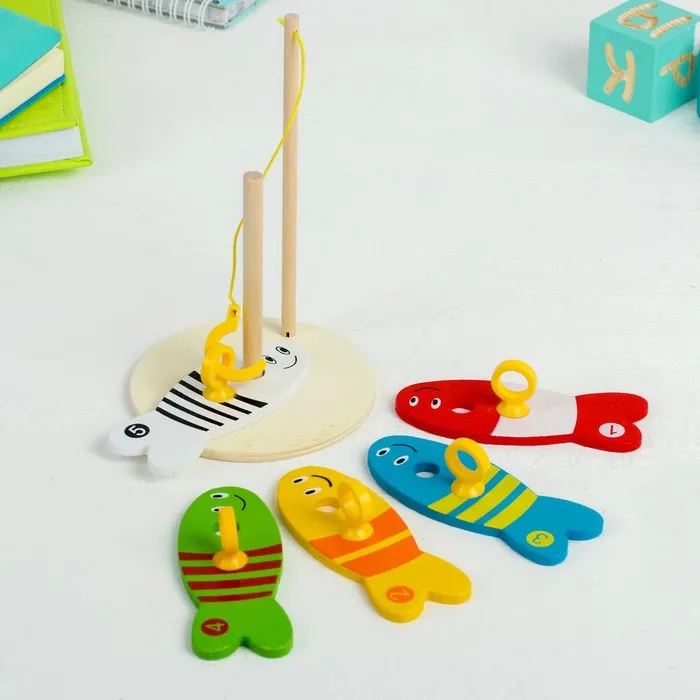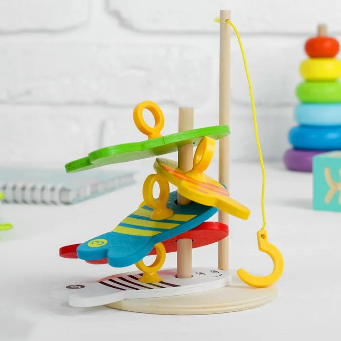 Деревянная рыбалка с крючком — это увлекательная и полезная игра для малышей. Набор включает 5 ярких рыбок, которые нужно ловить удочкой и нанизывать на штырёк. Игрушка сделана из натурального дерева и окрашена безопасными красками, что делает её идеальной для детей от 3 лет.
