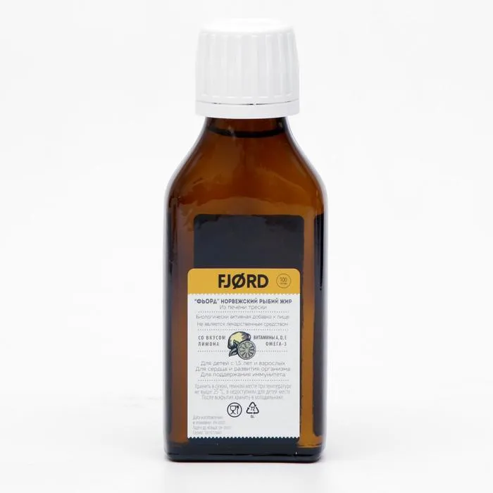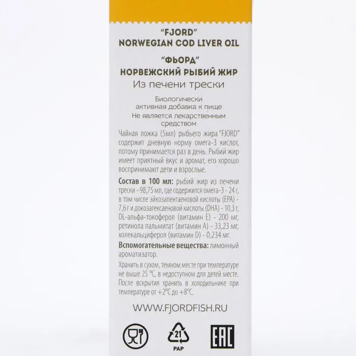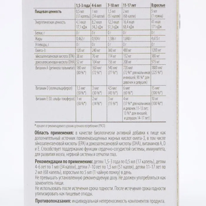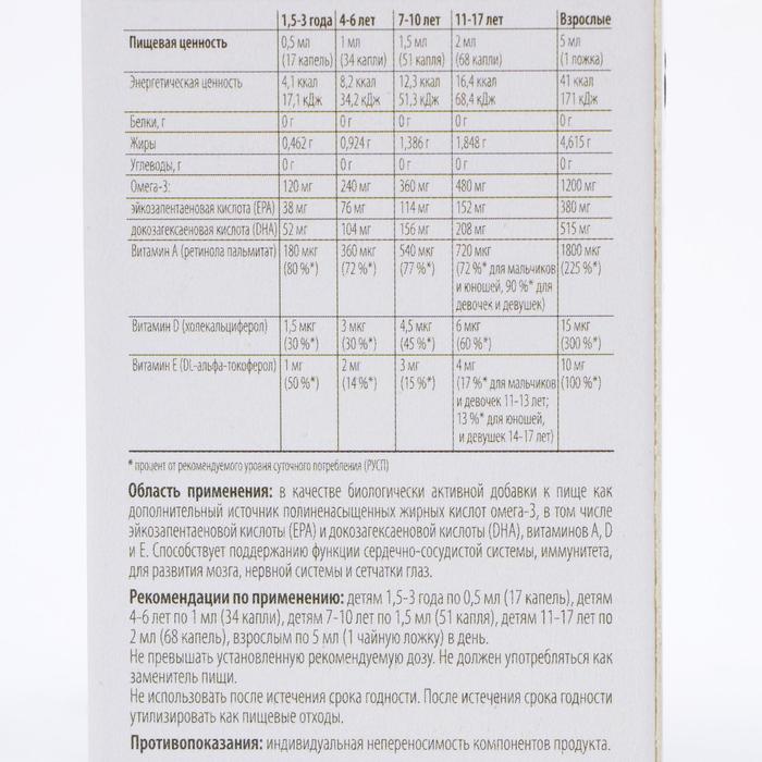 Состав: в 100 мл: рыбий жир из печени трески - 98,75 мл, где содержится омега-3 -24 г, в том числе эйкозапентаеновой кислоты (EPA) - 7,6 г и докозагексаеновой кислоты (DHA) - 10,3 г, DL - альфа-токоферол (Витамин Е) - 200мг, ретинола пальмитат (витамин А) - 33,23 мг, холекальциферол (витамин D) - 0, 234 мг.