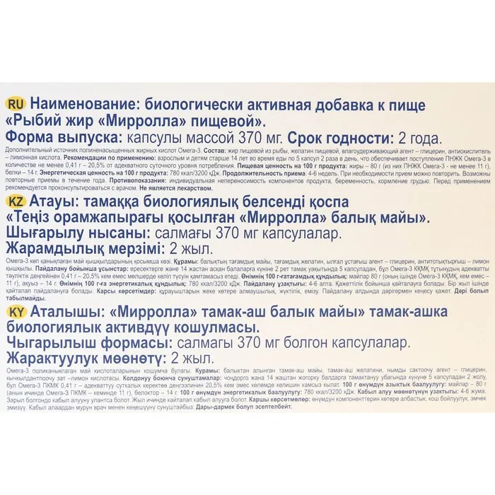 Рыбий жир Mirrolla, 200 капсул по 370 мг — Характеристики