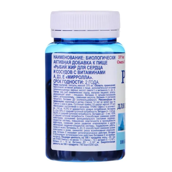 Суточный прием (10 капсул массой 370 мг) обеспечивает поступление в организм: ПНЖК Омега-3 в количестве – 330 мг, 16,5% от адекватного уровня потребления, Витамина Е – 5 мг, 50% от средней суточной потребности, Витамин А – 0,45 мг, 56,25% от средней суточной потребности. Витамин Д3 – 5 мкг, 100% от средней суточной потребности.