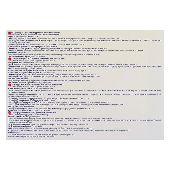 Состав: жир пищевой рыбный, масляный экстракт шиповника (масло подсолнечное, шиповник майский), оболочка капсулы — желатин, глицерин (Е422).