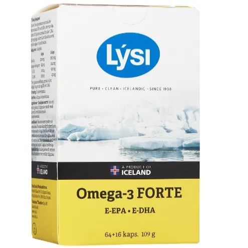 Lysi Omega 3 Forte - это мощный высококачественный продукт из рыбьего жира, богатый омега-3 жирными кислотами, E-EPA и E-DHA, которые важны для хорошего самочувствия организма. Содержит только омега-3 жирные кислоты, без витаминов, которые являются важными полиненасыщенными жирами. Организм человека нуждается в них, но сам производить не может - человек получает их из пищи или пищевых добавок. Жирные кислоты Омега-3 оказывают положительное влияние на работу сердца и мозга.