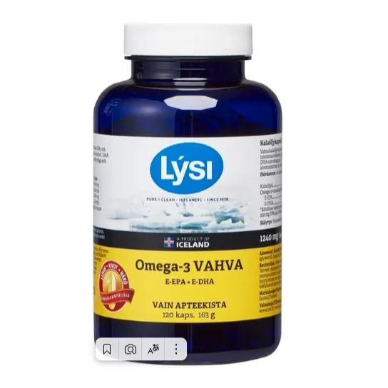 Lysi Omega 3 Vahva - сильный препарат рыбьего жира для поддержки вашего сердца. Капсула Lysi содержит много полезных для здоровья жирных кислот омега-3, которые, как известно, EPA и DHA способствуют нормальной работе сердца и улучшению функций работы мозга, поддержанию зрения в норме. Благоприятный эффект достигается при ежедневном приеме 250 мг. Без лактозы и без глютена.