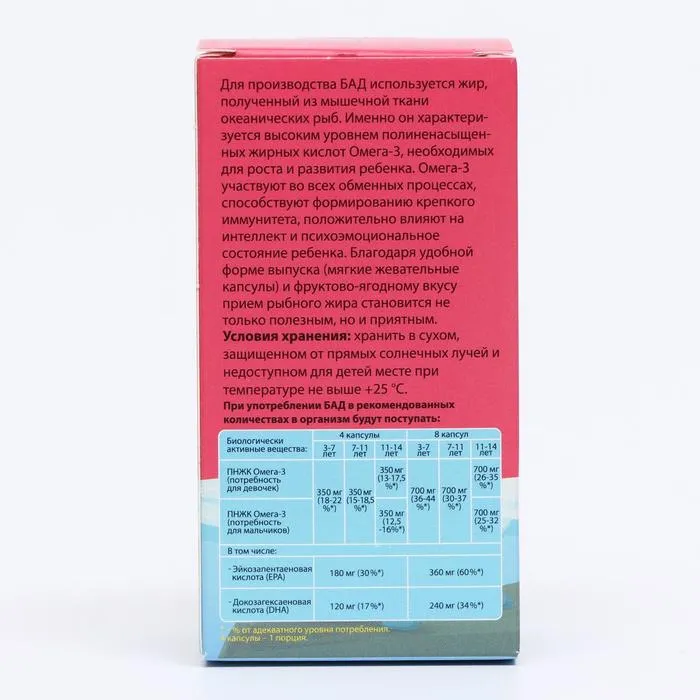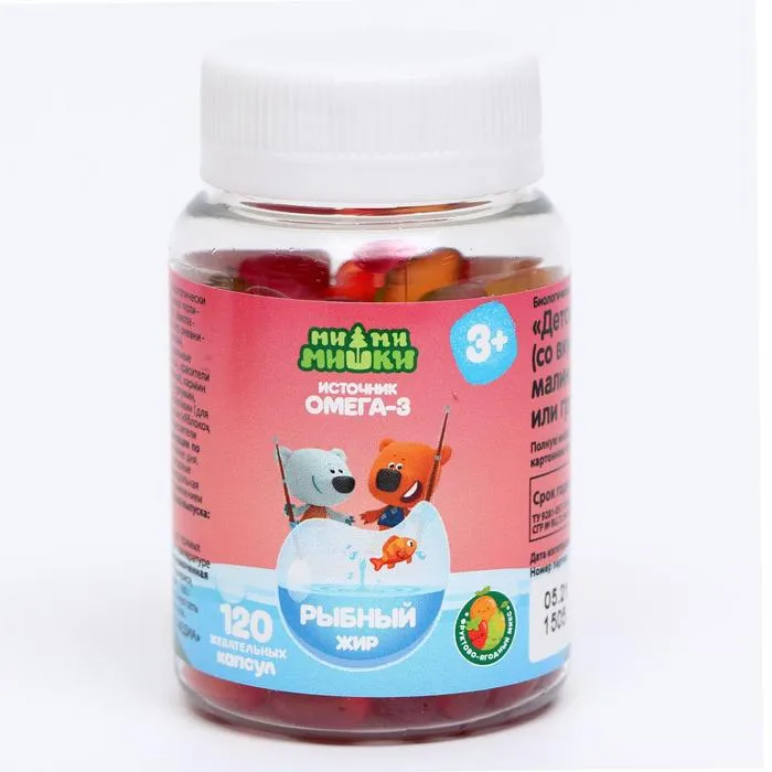 Детский рыбный жир получают из мышц и подкожного жира океанических рыб. По сравнению с рыбьим, рыбный жир содержит большее количество полиненасыщенных жирных кислот (ПНЖК), необходимых для роста и развития ребенка. Омега-3 участвуют во всех обменных процессах, способствуют формированию крепкого иммунитета, положительно влияют на интеллект и психоэмоциональное состояние ребенка. Благодаря мягким жевательным капсулам и фруктово-ягодному вкусу прием рыбного жира становится не только полезным, но и приятным.
