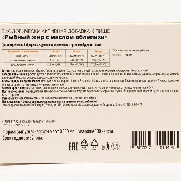 Состав: жир океанических рыб, оболочка (желатин, глицерин (пластификатор), вода), масло облепихи, смесь токоферолов (антиокислитель).