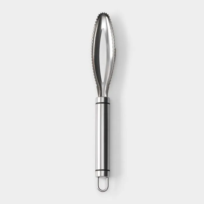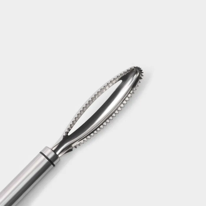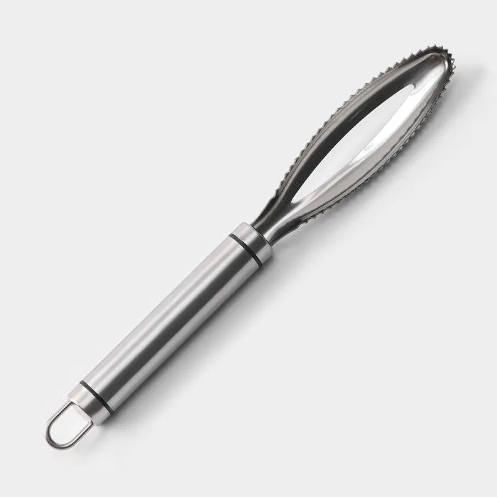 - Приспособление для чистки рыбы имеет оптимальную длину и необходимое количество зубцов, которое обеспечит комфортную очистку рыбы с крупной и мелкой чешуей.