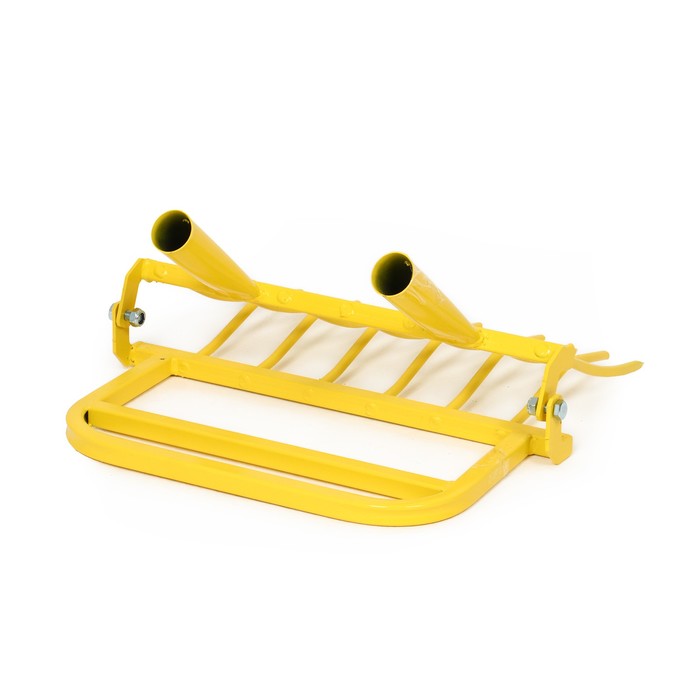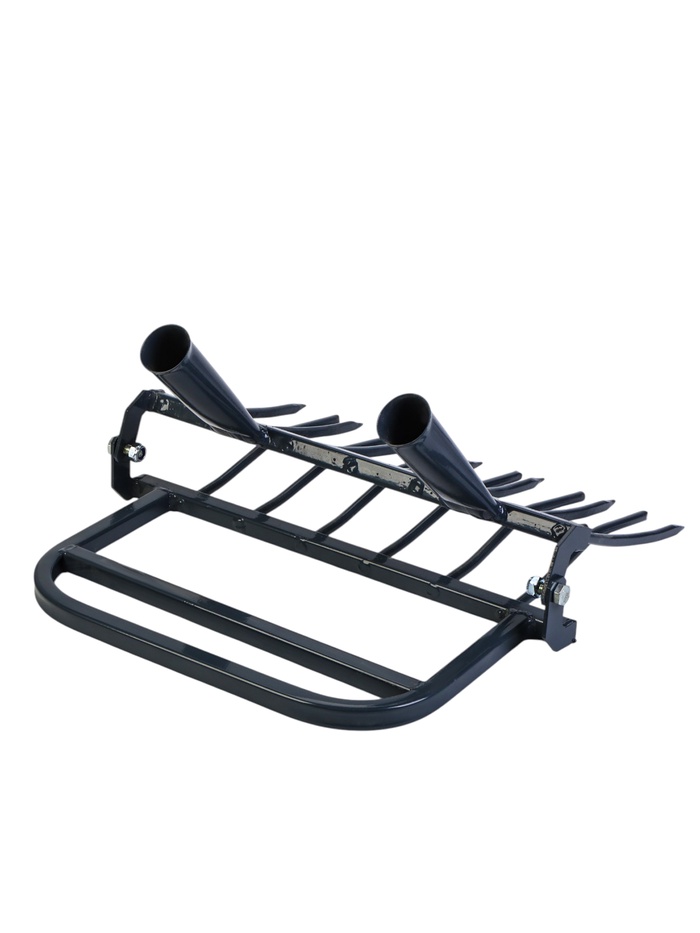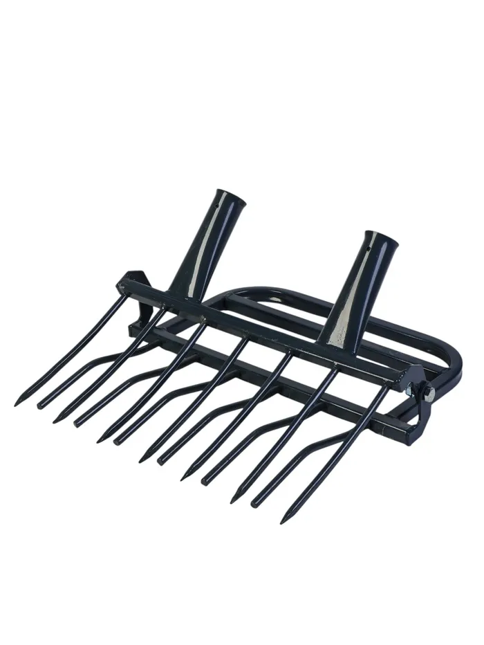 Инструмент состоит из качающегося рыхлителя на шарнире, оборудованного педалью для упора ноги, и двухчеренковых вил со стальными зубцами.
