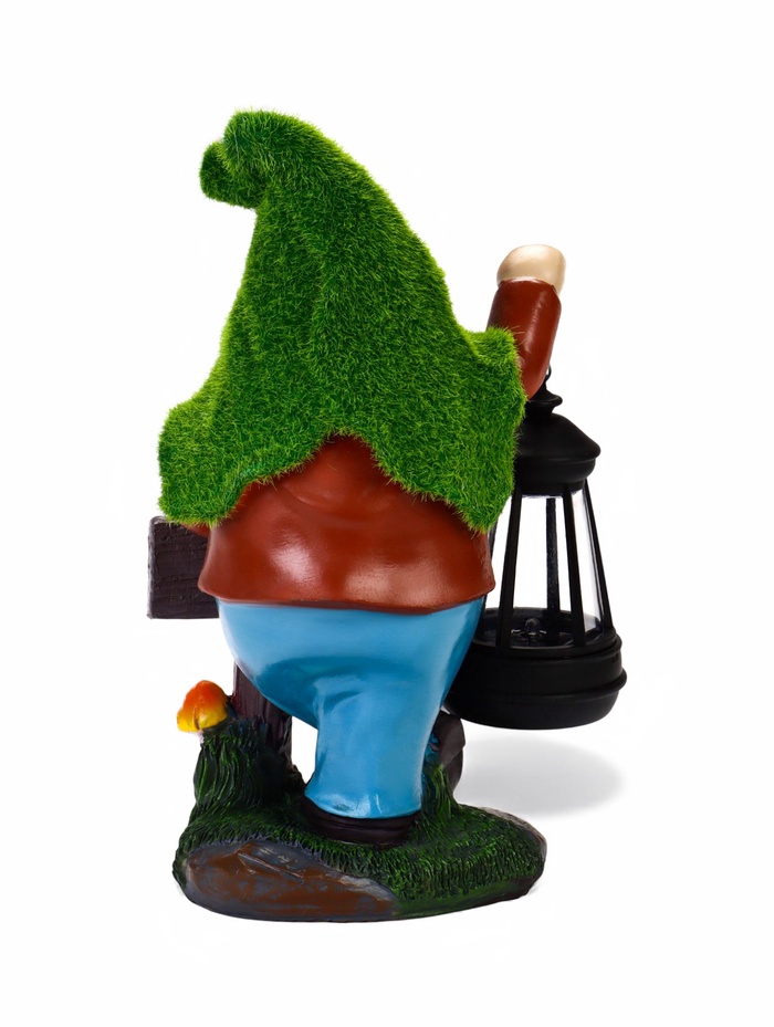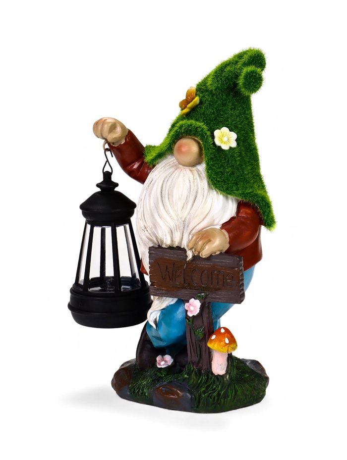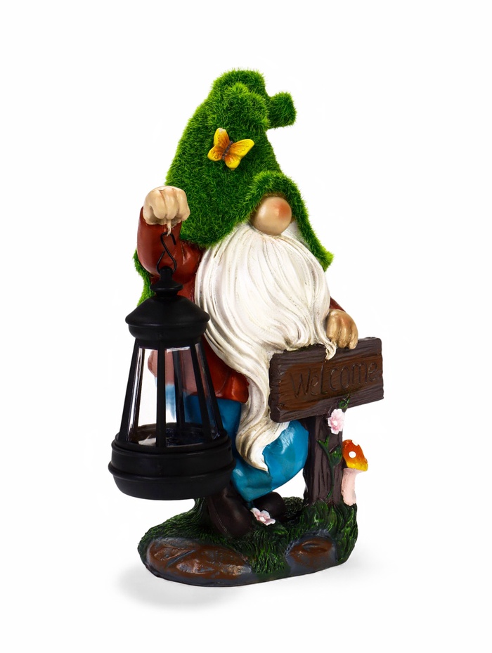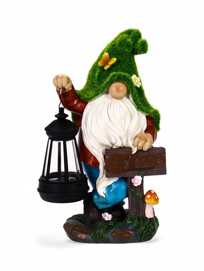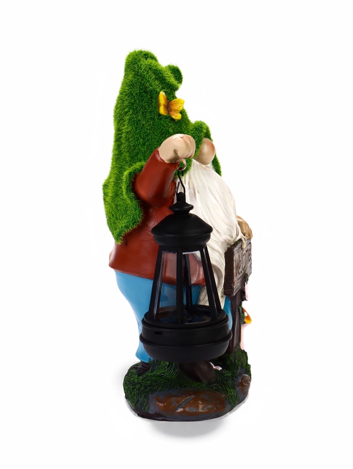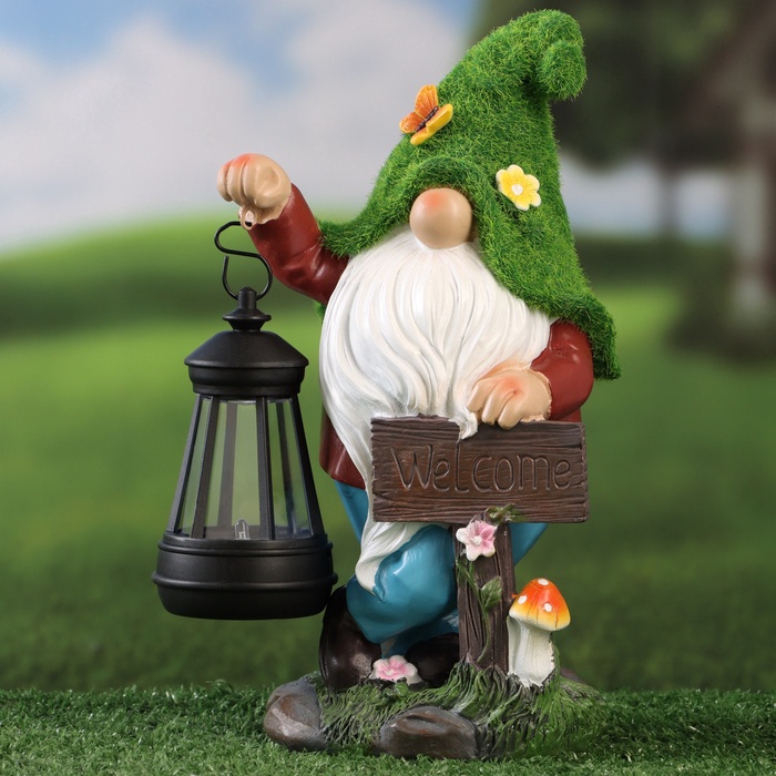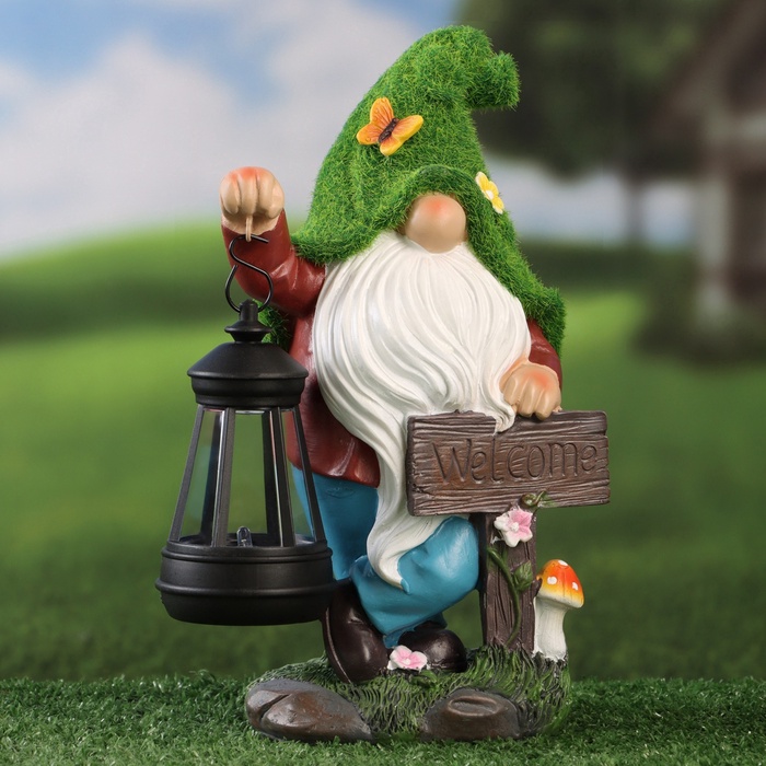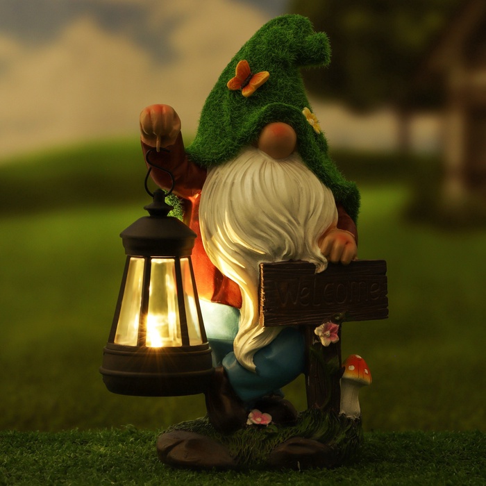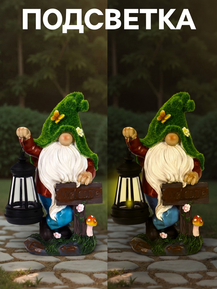 - Фонарь с гномом и надписью: фигурка гнома держит табличку с текстом Welcome. Днём это — яркий декоративный элемент, вечером — функциональный светильник.
