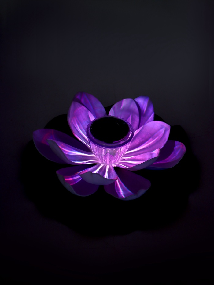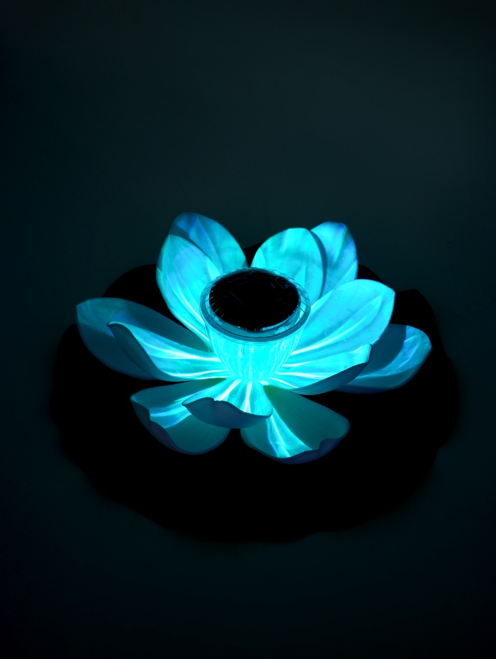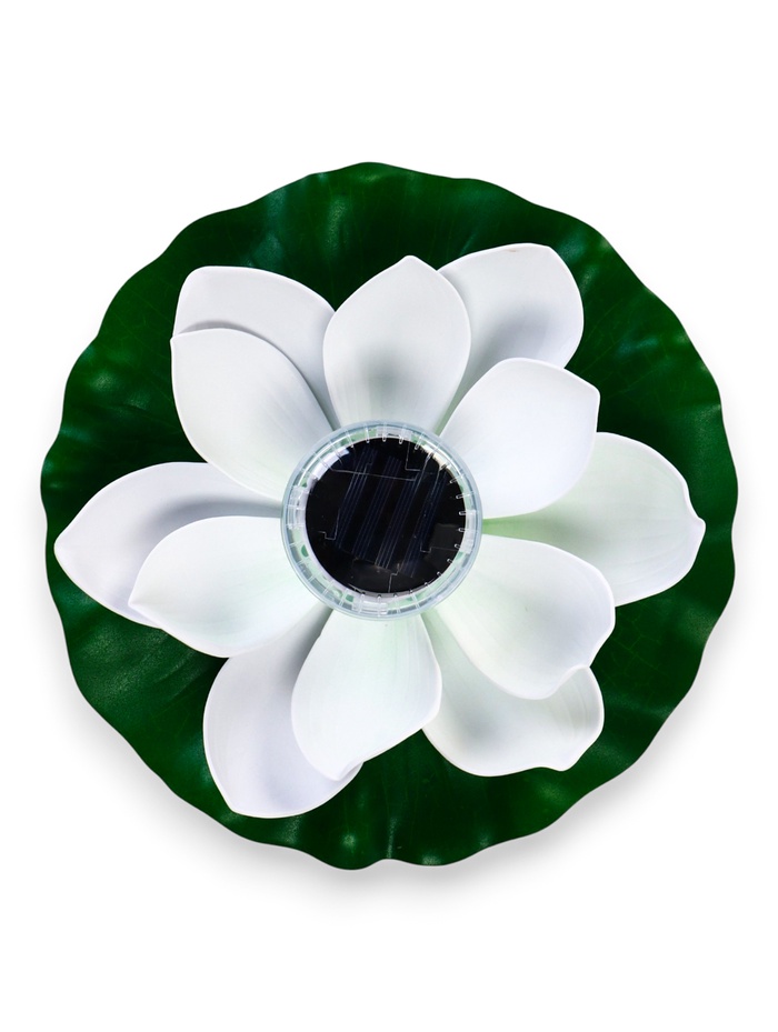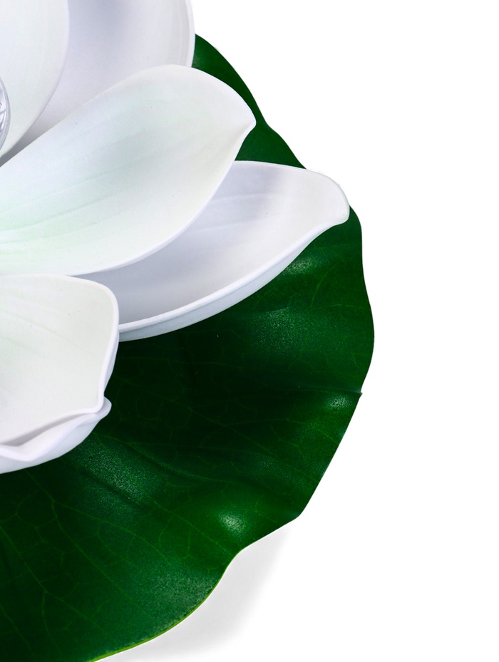 Садовая фигура-фонарь «Лотос» белого цвета — это садовая фигура со встроенной подсветкой. Она создаёт на воде эффект цветущего светильника: днём это лаконичный белый декор, а с наступлением темноты — источник мягкого свечения.