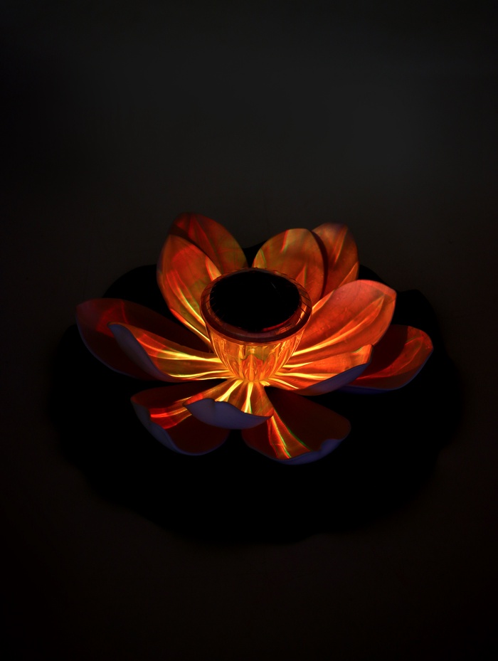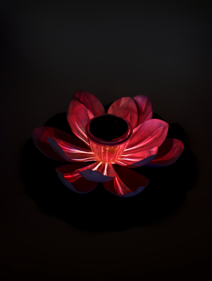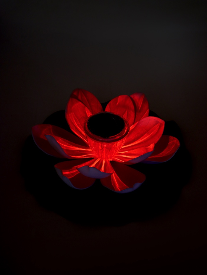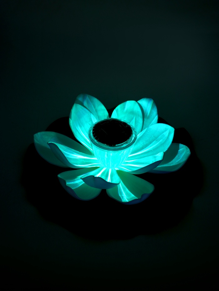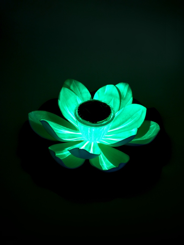 - Плавающая конструкция: фонарь устойчиво держится на поверхности воды. Лёгкие колебания от ветра добавляют динамики, оживляя зеркало пруда.