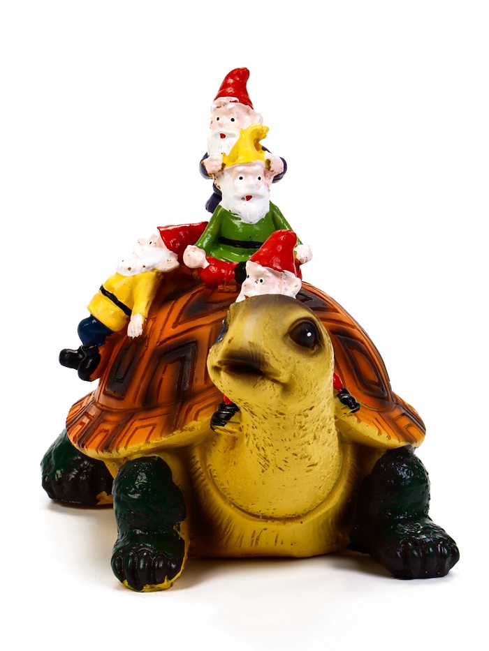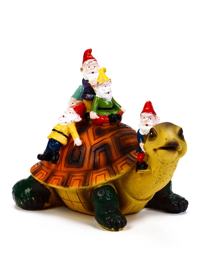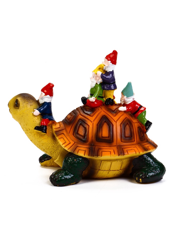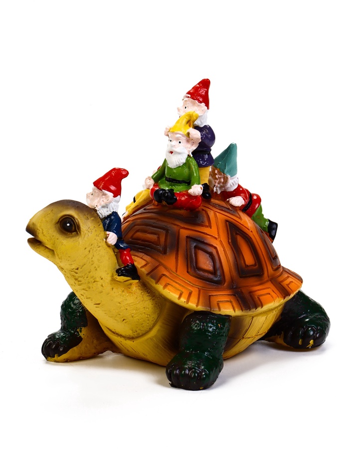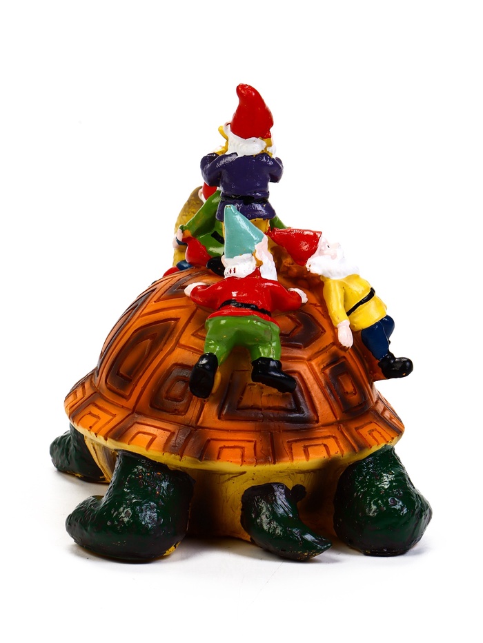 - Мультяшный стиль: фигура выполнена в добром, немного сказочном стиле. У черепахи добродушная мордочка, а гномы на её спине забавно устроились в путешествии. Яркие цвета поднимают настроение.