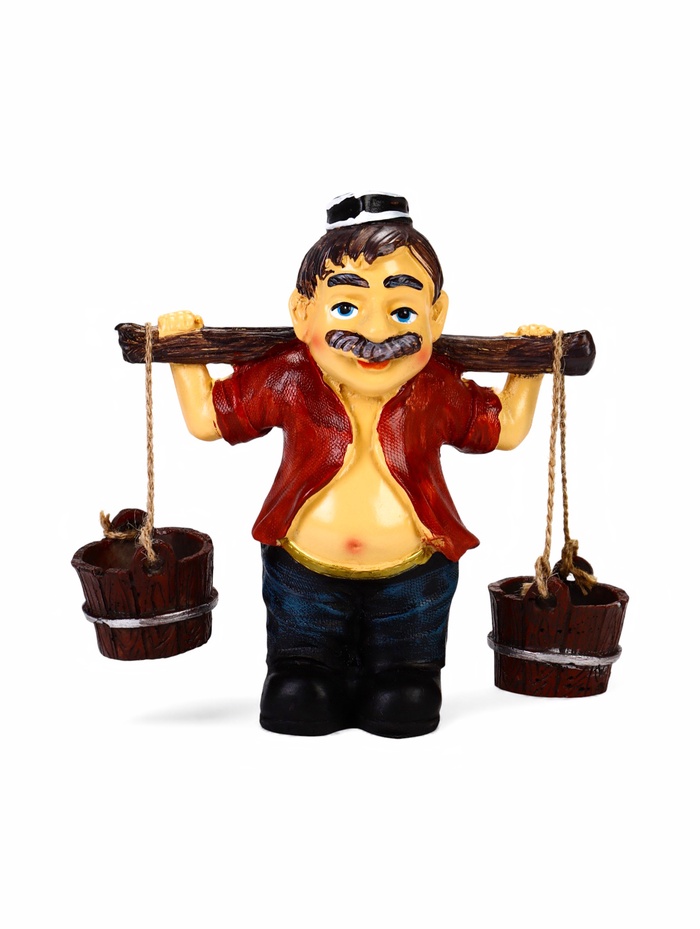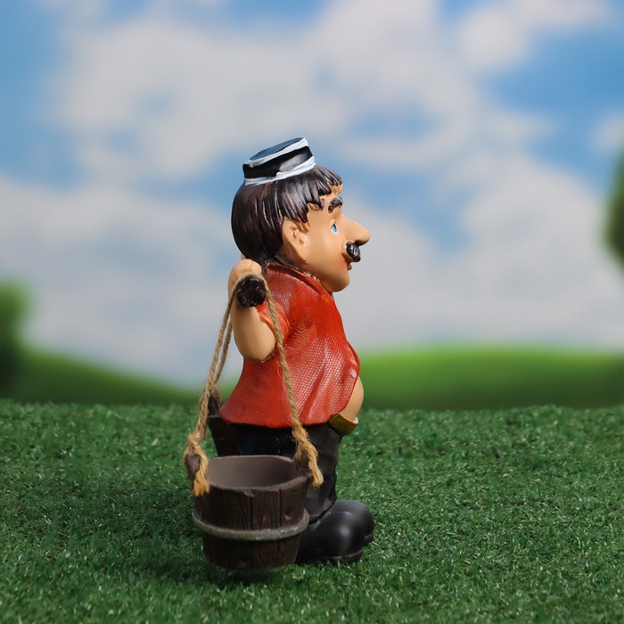 - Сюжетная композиция: фигурка изображает дедушку с коромыслом и двумя вёдрами. Динамичная поза и детали одежды создают законченный образ, оживляющий садовое пространство.