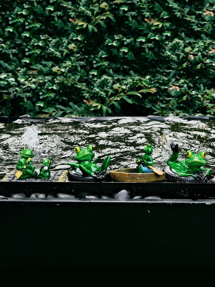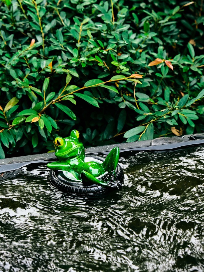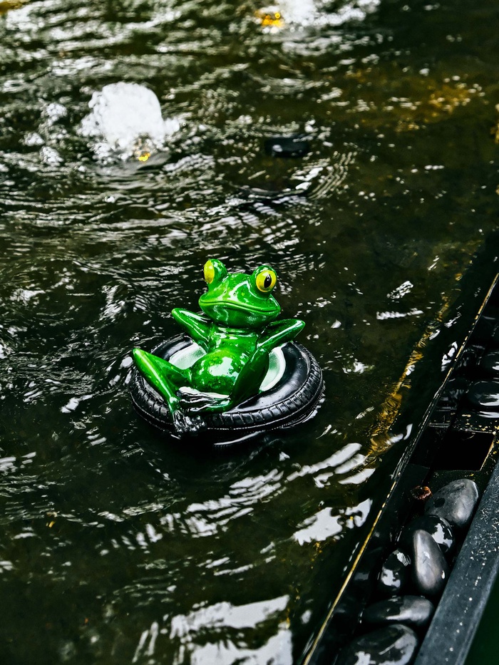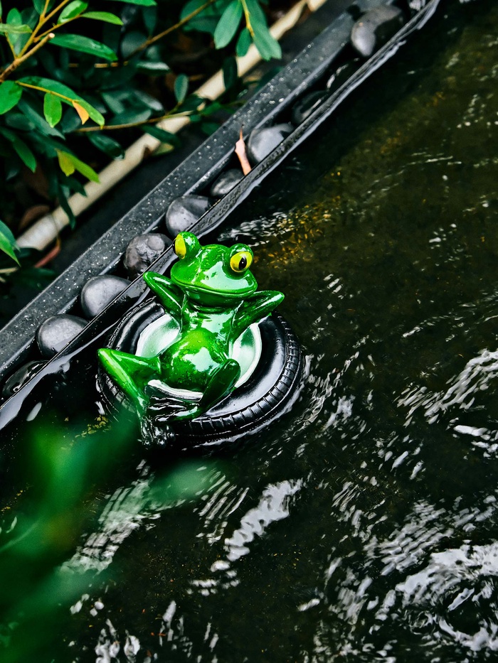 Идея для декора: фигурка лягушки на шине дополняет ландшафт готовым сюжетом. Это лаконичное украшение для берега садового пруда, альпийской горки или зоны отдыха. Небольшая деталь, которая делает сад живее и интереснее.