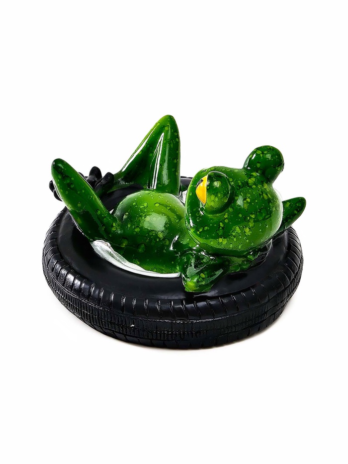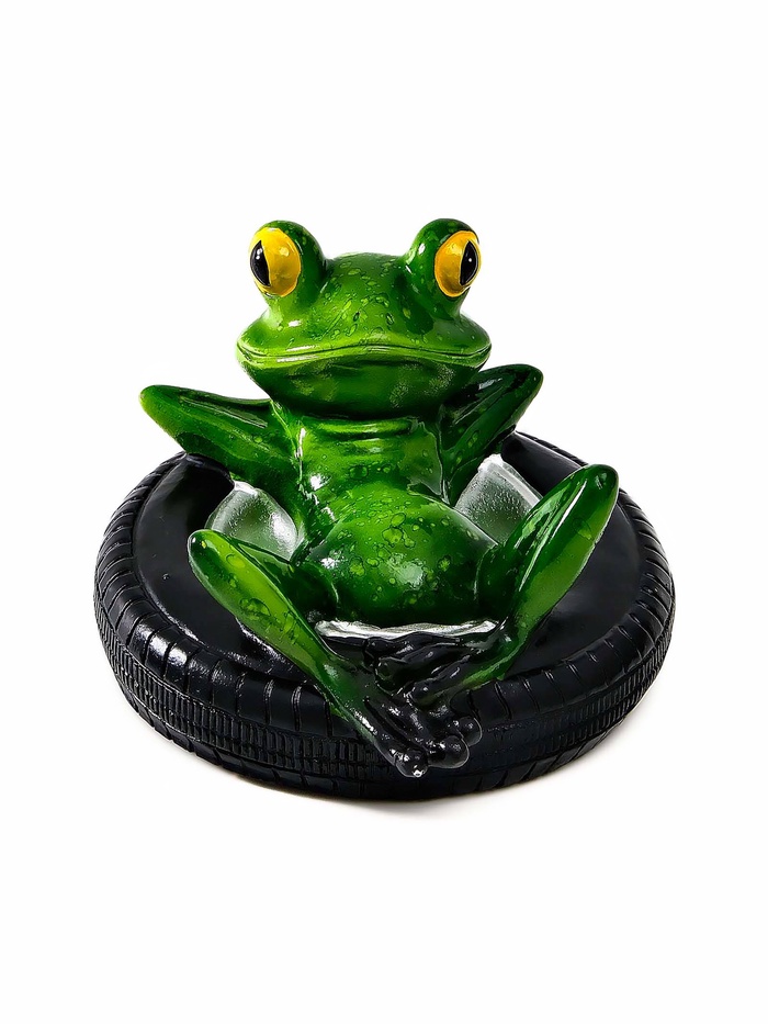• Художественный образ лягушки: фигурка изображает амфибию в расслабленной позе на автомобильной покрышке. Многоцветная роспись подчёркивает детали и добавляет реалистичности.