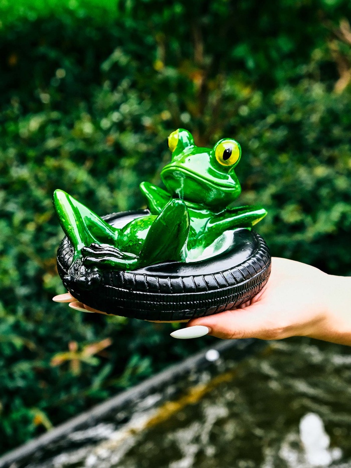 Садовая фигура «Лягушка на шине» из полистоуна — это небольшой акцент для сада или террасы. Забавная скульптура создаёт игривое настроение и оживляет пространство у воды или среди цветов.