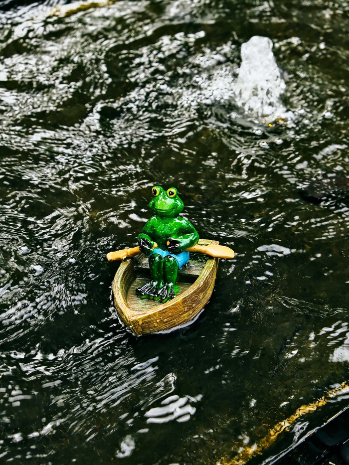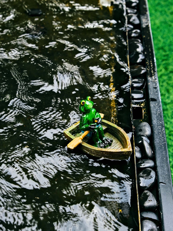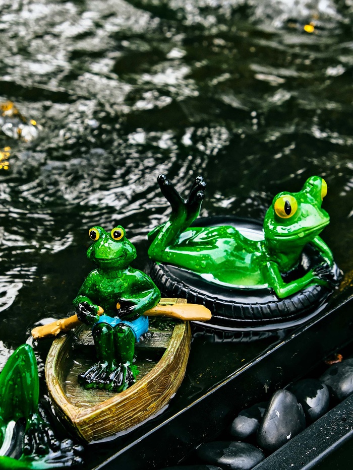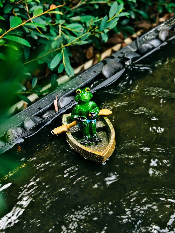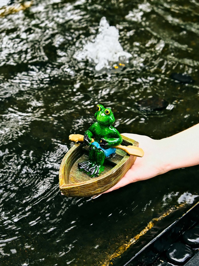 - Скульптура лягушки в лодке: фигурка изображает амфибию, плывущую в деревянной лодочке. Многоцветная ручная роспись прорабатывает детали от чешуек до деревянных бортов.