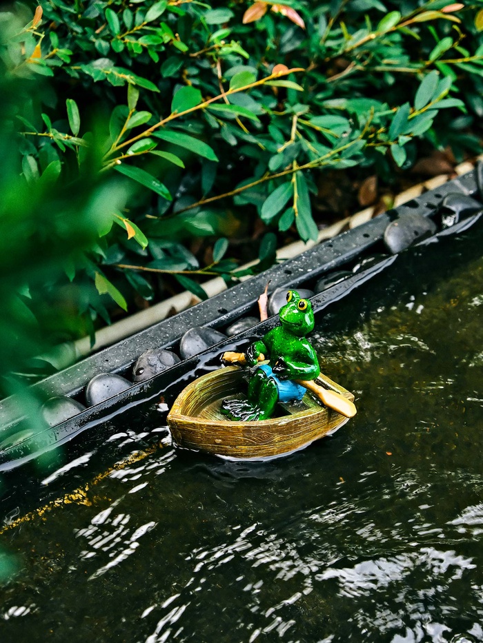 Идея для садового декора: фигурка создаёт готовую миниатюрную историю у воды. Это украшение для садового пруда, альпинария или зоны отдыха. Небольшой акцент, который делает ландшафт более обжитым и интересным.